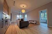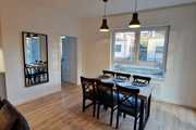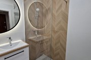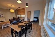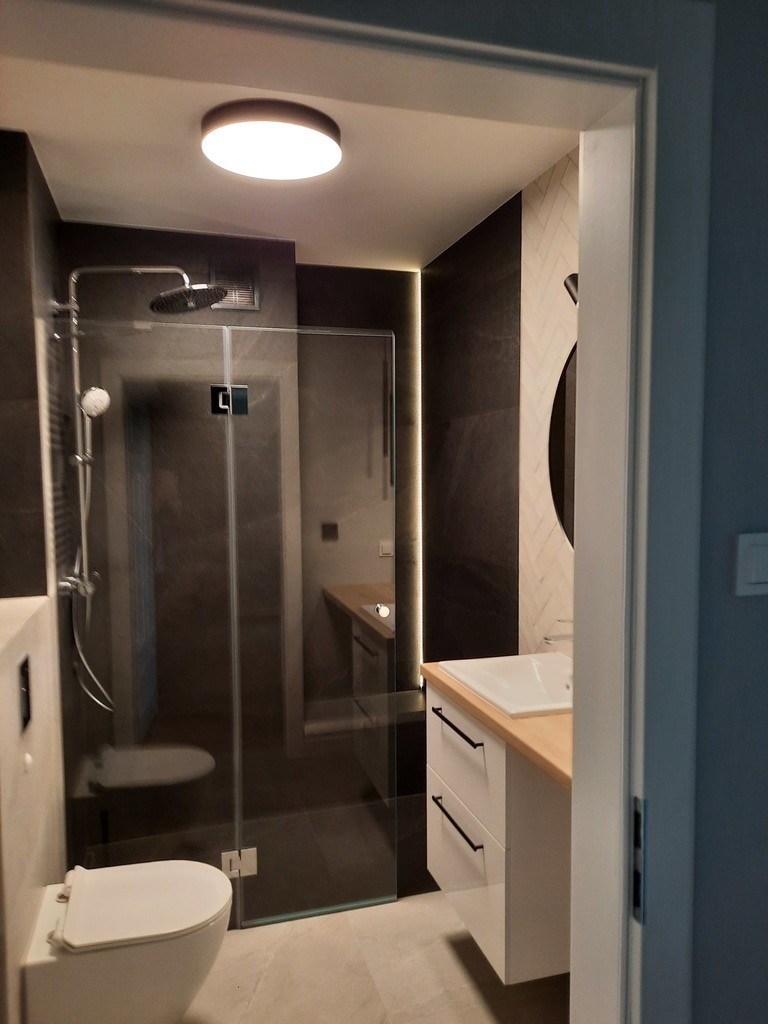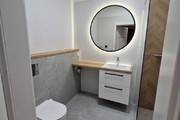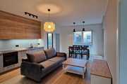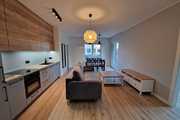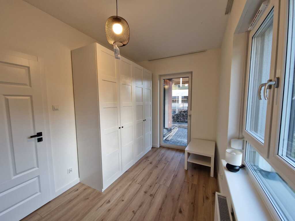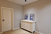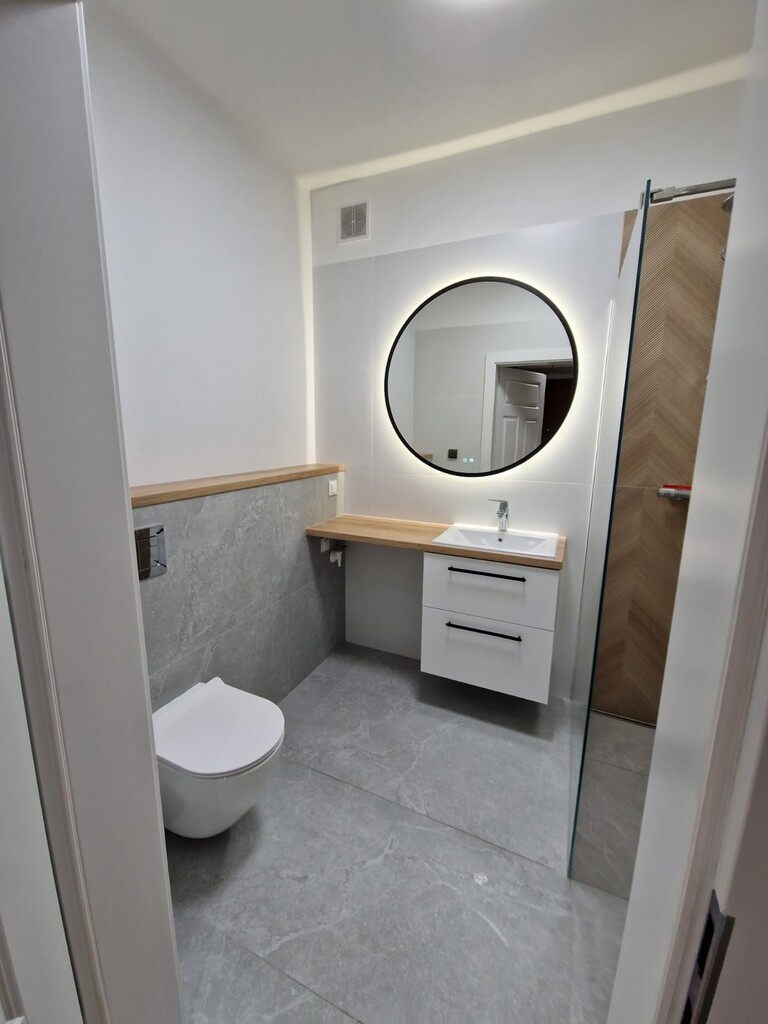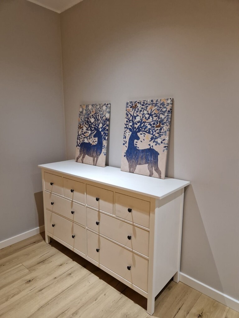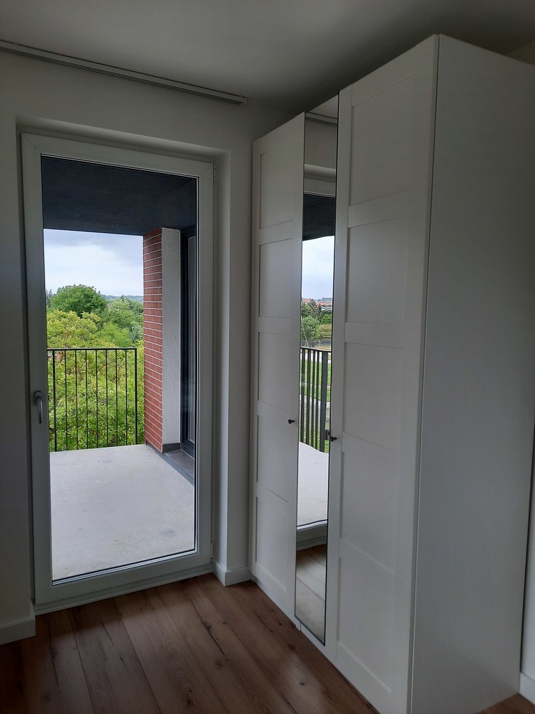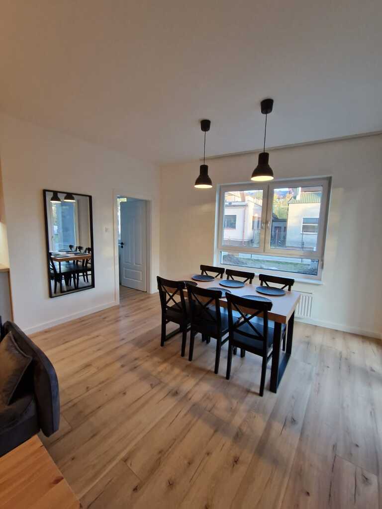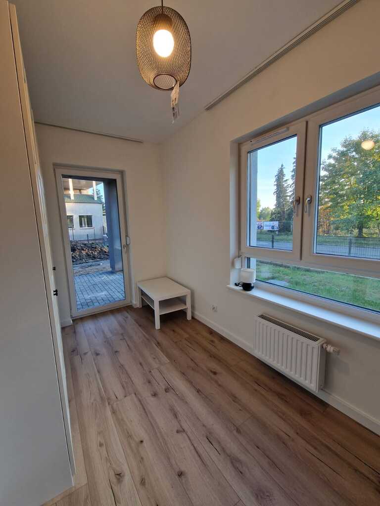 Available immediately 3-room apartment with an area of 60 m2 located on the ground floor of a new apartment building from 2022 with an elevator and a garden of over 100 m2, located in Gumieńce. Fenced, monitored area, entry to the property through a barrier. Living room combined with a kitchenette, bedroom with entrance from the corridor, bedroom with balcony – entrance from the living room and bathroom, hall, balcony. City heating and hot water. High standard of finishing the apartment. Rent PLN 5,000, rent to the manager PLN 500, electricity. total rent to the manager with fees around PLN 900. Parking space fee PLN 200. One-month deposit required, deposit for animals PLN 7,000. LIVING ROOM: Smooth walls and ceilings, painted with Flugger paints. Waterproof floor panels by Meister. MDF skirting boards, 8 cm high. Ceiling curtain rods with IKEA Majgul curtains. 3-seater sofa bed with sleeping function and bedding container LUKAS – AGATA MEBLE. Carpet. Coffee table with wooden shelf – IKEA HEMNES. Wooden TV cabinet – IKEA HEMNES. BEDROOMS: Walls and ceilings smoothed and painted with Flugger paints. Waterproof floor panels by Meister. MDF skirting boards, 8 cm high. Ceiling curtain rods with IKEA Majgul curtains. Graphite upholstered bed 140 cm IKEA BJORBEKK with a hard AKREHAMN foam mattress with a removable cover. Bedside table. Black pendant lamp and standing bedside lamp. HALLWAY: Wardrobe – IKEA PAX. Lighting. BATHROOM: Stoneware tiles on the walls and floor. Walk-in glass shower screen, thermostatic mixer tap, rain shower and separate shower head by Grohe, linear drain in the floor. Washbasin with 60 cm cabinet (2 drawers), wooden countertop, Grohe mixer tap. Mirror with wall lamp. Washing machine connection. Toilet on a built-in stoneware frame. Bathroom doors by Polskone, Fiord type, black door handles. KITCHEN: Built-in kitchen furniture with Samsung household appliances (fridge-freezer, dishwasher, oven, hob), Kernau hood permanently connected to the ventilation shaft. Single-bowl black sink. Flexible black sink mixer tap. Wooden kitchen table with chairs.