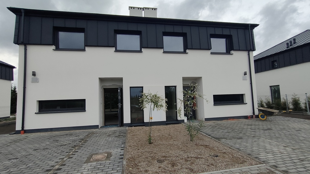 A new, spacious, single-story semi-detached building with a total area of 103.8 m2. Very good and easy access to the building via a lit asphalt road. The area is ecologically clean. Fresh air and open green areas near the house. In the vicinity there is a cozy housing estate of detached houses, with some semi-detached houses here and there. The plot area is approximately 350 m2. The plot is partially fenced. Parking possible at the entrance. The building has very good thermal parameters. Triple-glazed PVC windows. There is a possibility of connecting a fireplace in the living room on the ground floor. External and internal load-bearing walls made of aerated concrete. Internal walls made of 12 cm thick aerated concrete blocks. Floor heating. The price includes a two-circuit central heating furnace with a closed combustion chamber. The building is separated from the other by a wall and a layer of insulation. Anti-burglary external doors to the building. Completion of the development phase in spring 2024. The plot is fenced on three sides. ALL UTILITIES: Water, sanitary sewage system, storm sewage system, electricity, gas, optical fiber. Room layout as follows: Ground floor: Living room – 32.75 m2 Kitchen – 10.05 m2 WC – 1.86 m2 Corridor – 3.95 m2 Room. Utility – 3.11 m2 Room. Utility – 1.48 m2 Stairs – 5.44 m2 Total: 58.64 m2 —————————– Floor without slopes : Bedroom 12.63 m2 Bedroom 10.90 m2 Bedroom 10.55 m2 Wardrobe – 3.28 m2 Bathroom – 7.66 m2 Corridor (4.98 m2) Finishing standard: – plasters, floors – installations distributed throughout the building – windows Triple-glazed PVC – high-class condensing furnace – external doors with two locks – attic insulation with PUR foam. Possibility to install carports between buildings. In Mierzyn there are shops, a post office, a bus stop, a church, a playground, bicycle and walking paths, and commercial and service outlets. New big school. The appearance of the building and its surfaces may differ slightly from the information provided in the above description. Starting price PLN 999,000. The building is ready for sale