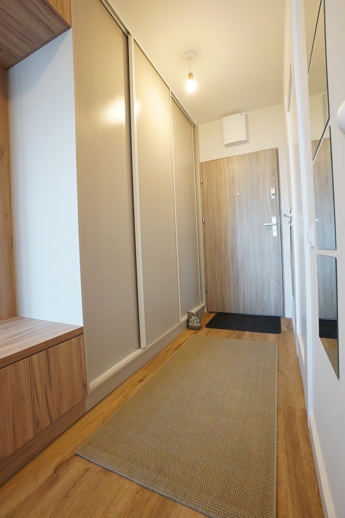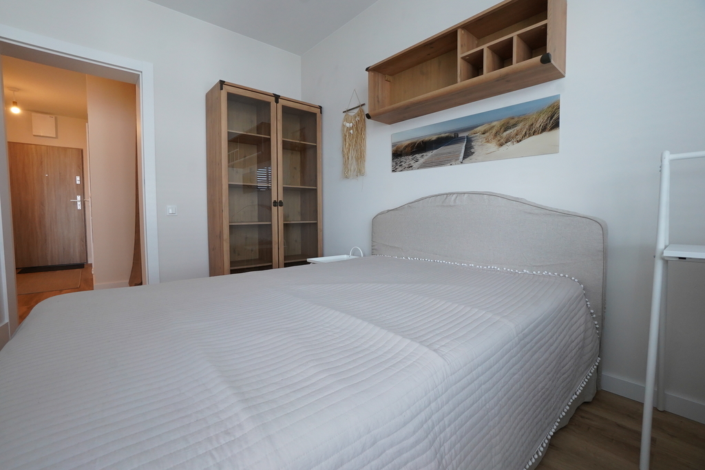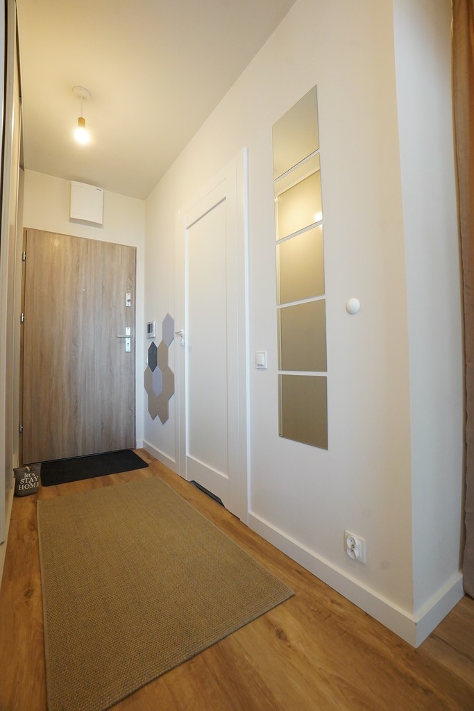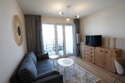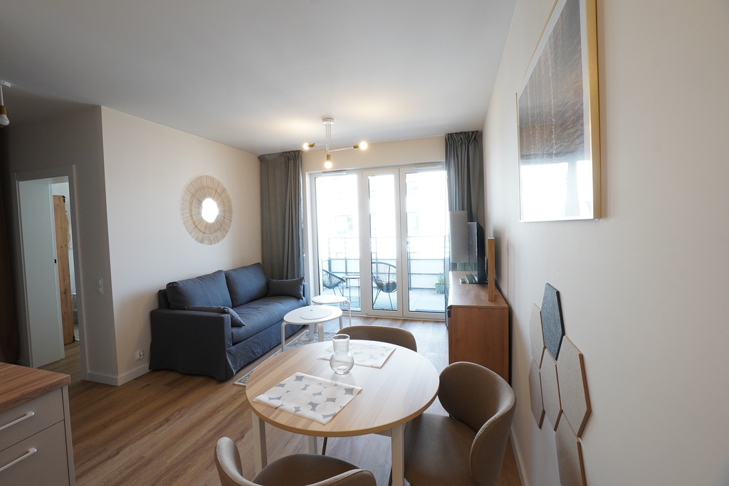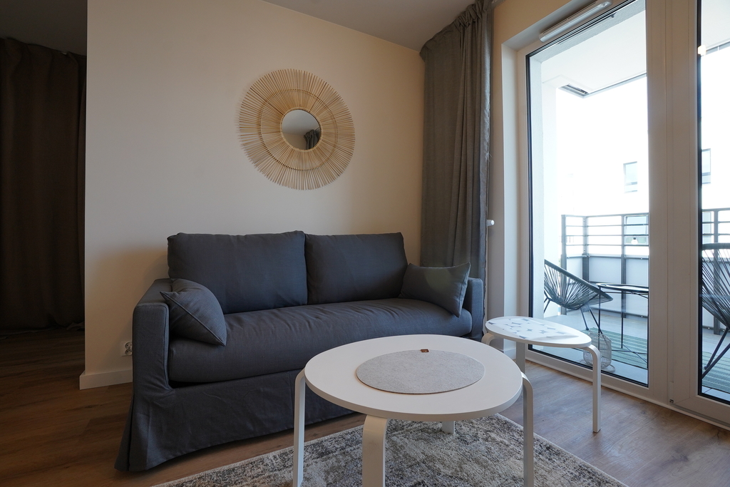 An apartment for rent in a recently built block, furnished in a modern style. An apartment with an area of 39.65 m2 consisting of a living room with a kitchenette, a bedroom, a bathroom, a hall and a balcony, and two parking spaces in the underground garage – PLN 300 per space. The apartment is well-kept, furnished and equipped with the most necessary things. The apartment is located on the fourth floor, the building has an elevator. Quick access to the center by public transport.