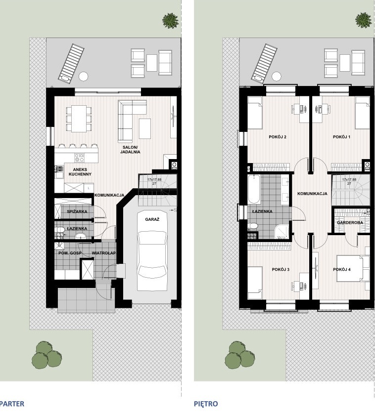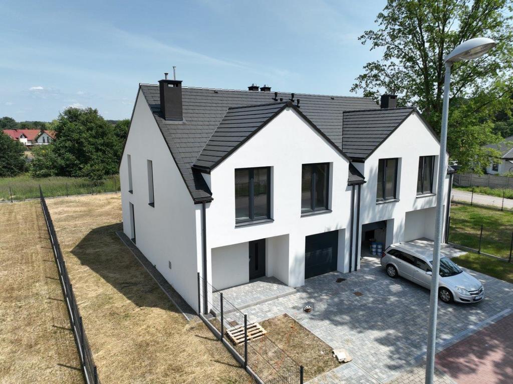 The houses are characterized by the highest quality of materials used, a well-thought-out and functional layout of rooms and a very good location with access to public transport. What distinguishes the investment are undoubtedly ready-made gardens with full infrastructure, i.e. driveways and fencing. Possibility of individual interior design with the help of an architect, which is included in the price. Elegant buildings with a functional interior and a garden complement the atmosphere of this place. Very good location, access to public transport, functional room layout, and consultations with an architect. Landscaped garden included in the price, built-in garage + parking space, high standard of workmanship. Gas heating – two-speed stove with a closed combustion chamber. The entire segment – underfloor heating. The driveway and approach are paved with cobblestones 7 km west of Szczecin, 5 km from the border crossing in Lubieszyn, 22 km from Police BUS LINES 105, 108, 123, 536 Very well-developed infrastructure: shops, primary school, church, gas station, post office, commune office, hairdressers and beauty salons, Dobra medical center and numerous bicycle routes. We invite