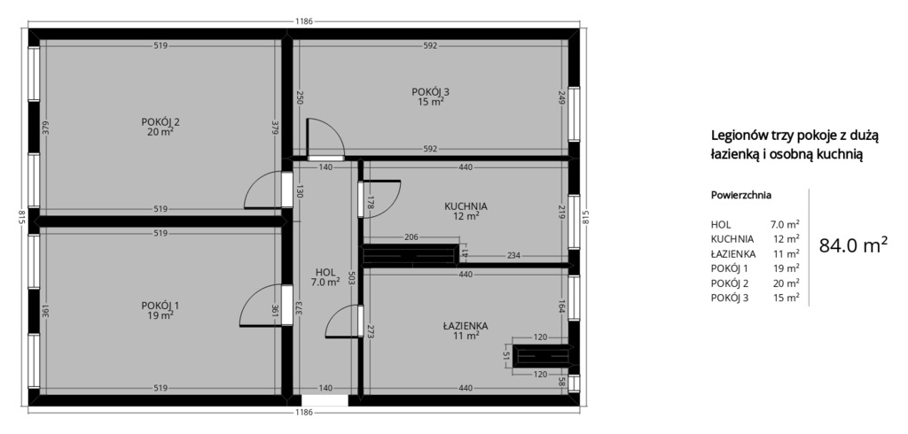 * area 84.26 sq m, 3 rooms, kitchen, bathroom, hall