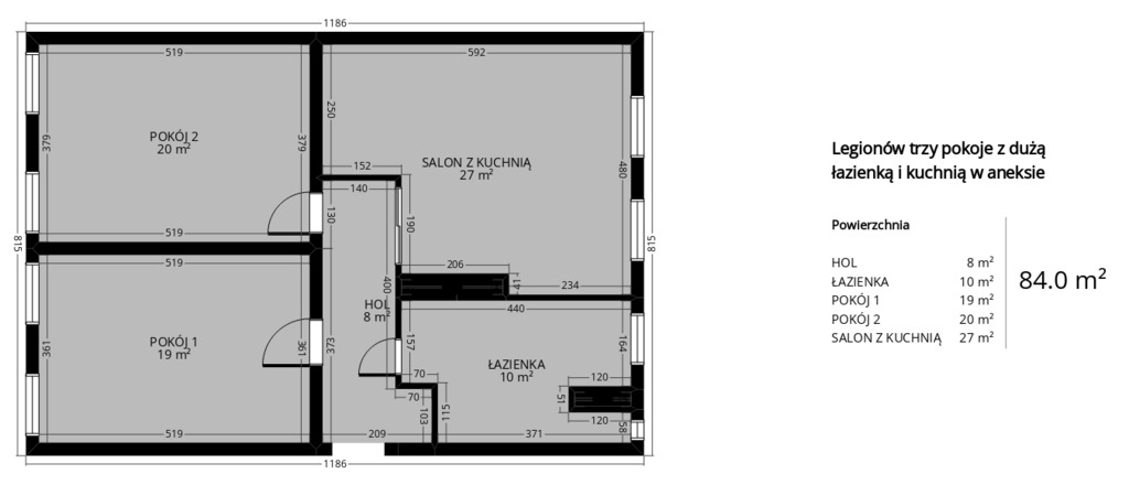 3. Possibility of moving the kitchen to a room separated as above, thanks to which we obtain additional space for the bathroom created by combining it with the former kitchen.