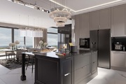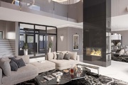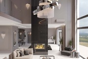 The living room flows smoothly into the open space where the kitchen and dining room are located, which are the heart of the house. Interestingly, this space is divided only by a double-sided fireplace that reaches all the way to the ceiling, giving a unique atmosphere to both the living room and the dining room. It is an ideal place to spend time together, cook and eat meals, where the glow of the fire adds warmth and charm to every meeting. You can also admire a beautiful view from the living room thanks to the mezzanine, which with its lightness contributes to the feeling of cozy space in this unique residence.