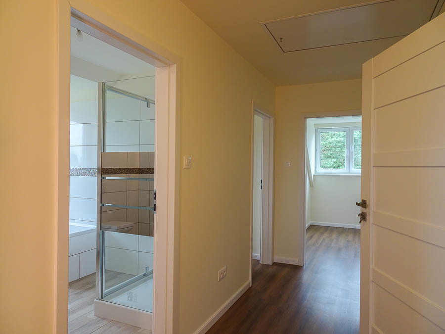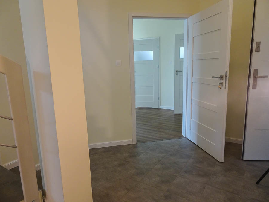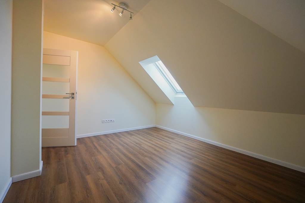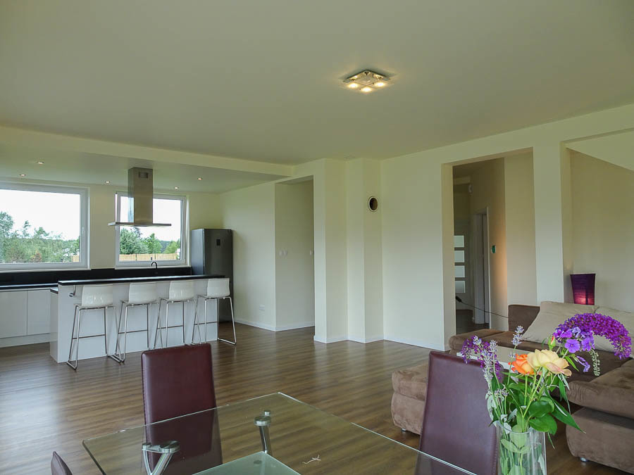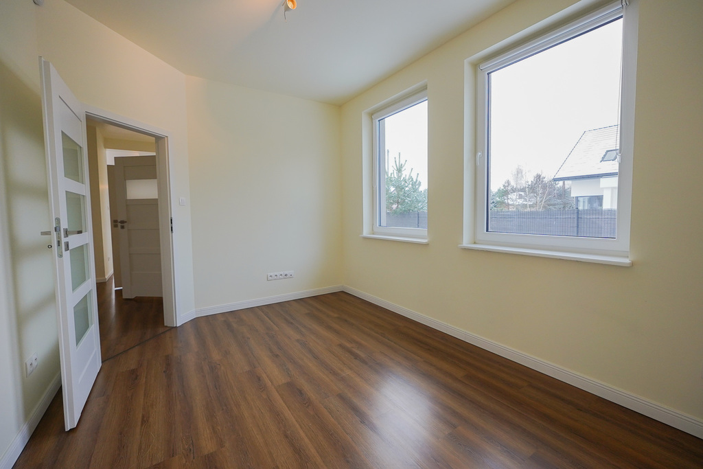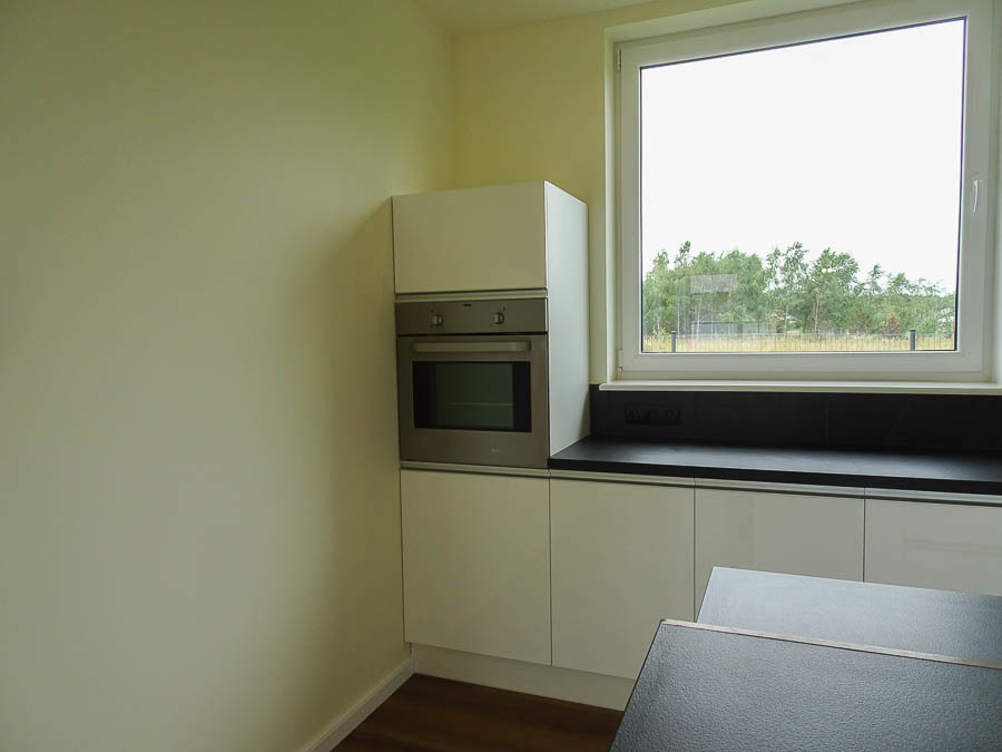 AVAILABLE IMMEDIATELY. Perfectly located new house IN SŁAWOSZEWO NEAR BARTOSZEWO put into use in 2020. Living room, kitchen, 4 bedrooms and two bathrooms and a garage. High quality materials were used for construction. Porotherm, roof covered with ceramic tiles. PVC windows, roof windows. Anti-burglary external doors. House insulated with polystyrene, plastered. Solar panels installed on the roof. Apart from the kitchen with built-in furniture and household appliances, there is no furniture. The tenant can be a company or NATO. HOUSE DESCRIPTION: GROUND FLOOR: living room 32 m2 connected to a bright kitchen 17 m2, bedroom 14 m2, hall 15.10 m2, bathroom with shower cabin, boiler room, garage for 1 car. Panels and terracotta on the floors. Built-in kitchen furniture with household appliances: fridge with freezer, 60 cm dishwasher, ceramic hob, oven. FIRST FLOOR: 3 bedrooms with, among others, skylights, bathroom 8.5 m2 with bathtub, shower cubicle, windows in bathrooms on the ground floor and on the first floor. Small unused attic above the first floor that can be used as a storage room. Comfortable, wide stairs between floors, with a landing. Water and sewage installations have been brought to the building. Heating – modern heat pump and photovoltaics. Large windows, nicely illuminating the interior. From the windows view of distant properties and greenery. The area in front of the building with grass. Fence with gate. Location near the forest, near walking routes leading to Lake Świdwie. Horse stud nearby. Very charming place. Garden on the south and west sides. Rent PLN 6,500 + operating fees water, sewage collection, garbage collection, electricity. So far, heating has been provided by a heat pump.