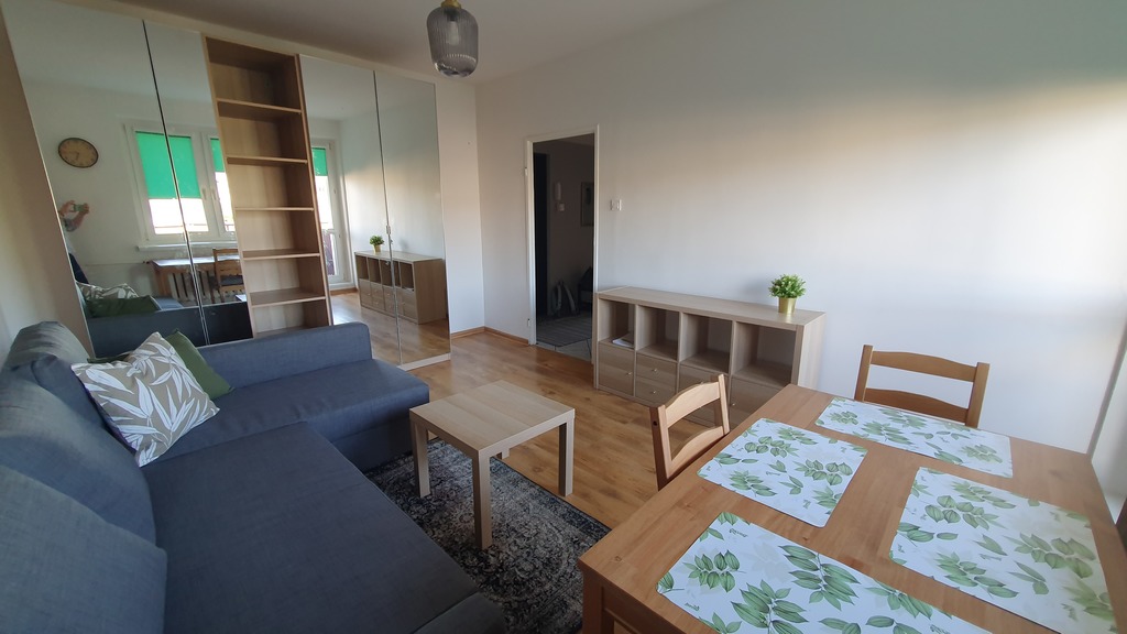 2-room apartment for rent in the Zawadzkiego estate in Szczecin. The area of 42 m2 consists of two rooms (the living room opens onto a large balcony), a separate kitchen, a bathroom with a bathtub, a toilet and a hall. The apartment is furnished (new furniture), ready to move in from August 1, 2024. There is a large, spacious wardrobe in the living room and a fully furnished kitchen with a large fridge. The rent for the cooperative with advance payments for water and district heating is PLN 550. Parking spaces for residents under the block (remote-controlled barrier). Bright apartment, lots of greenery in the building. Perfectly connected to the entire city (tram and bus stops). Nearby there are shops, schools, a park, squares and the Netto Arena entertainment and sports hall.