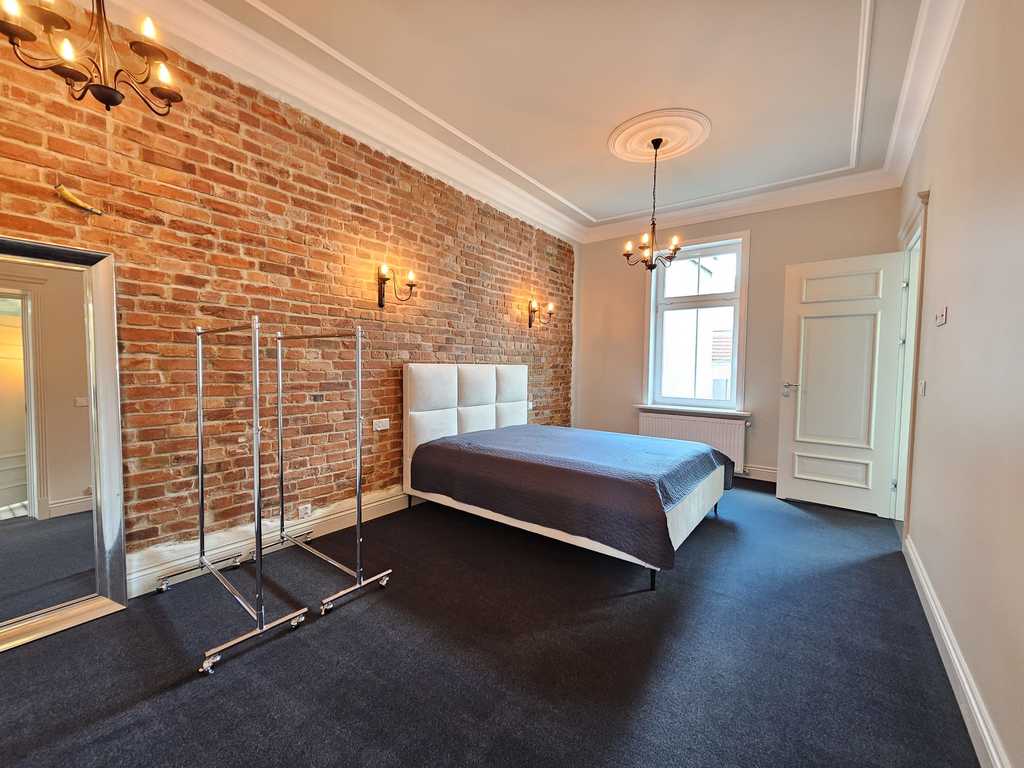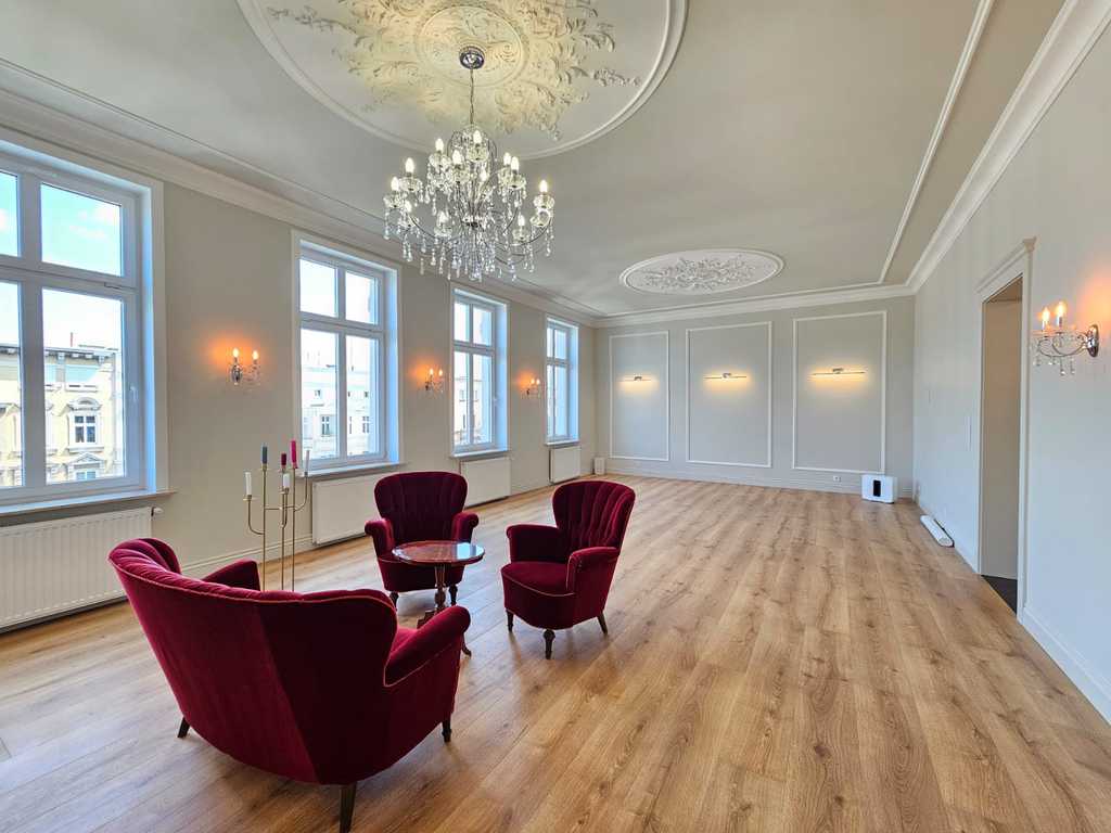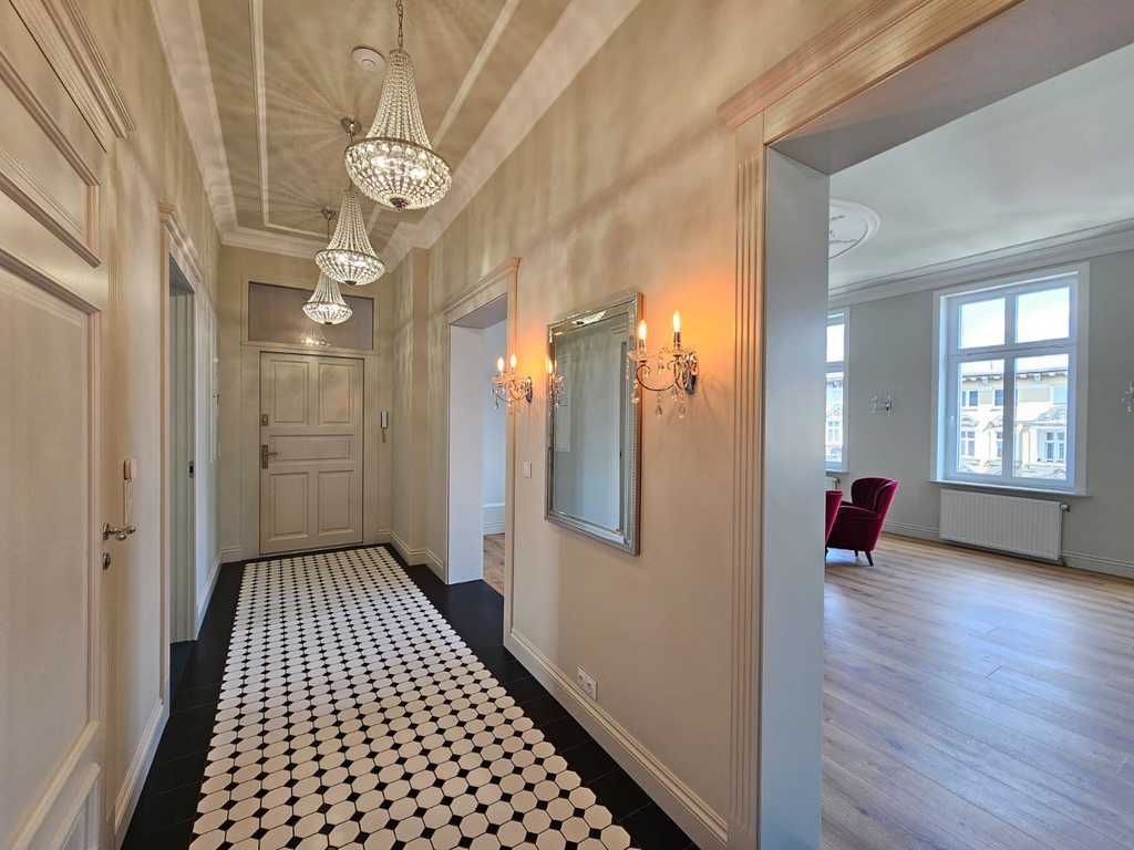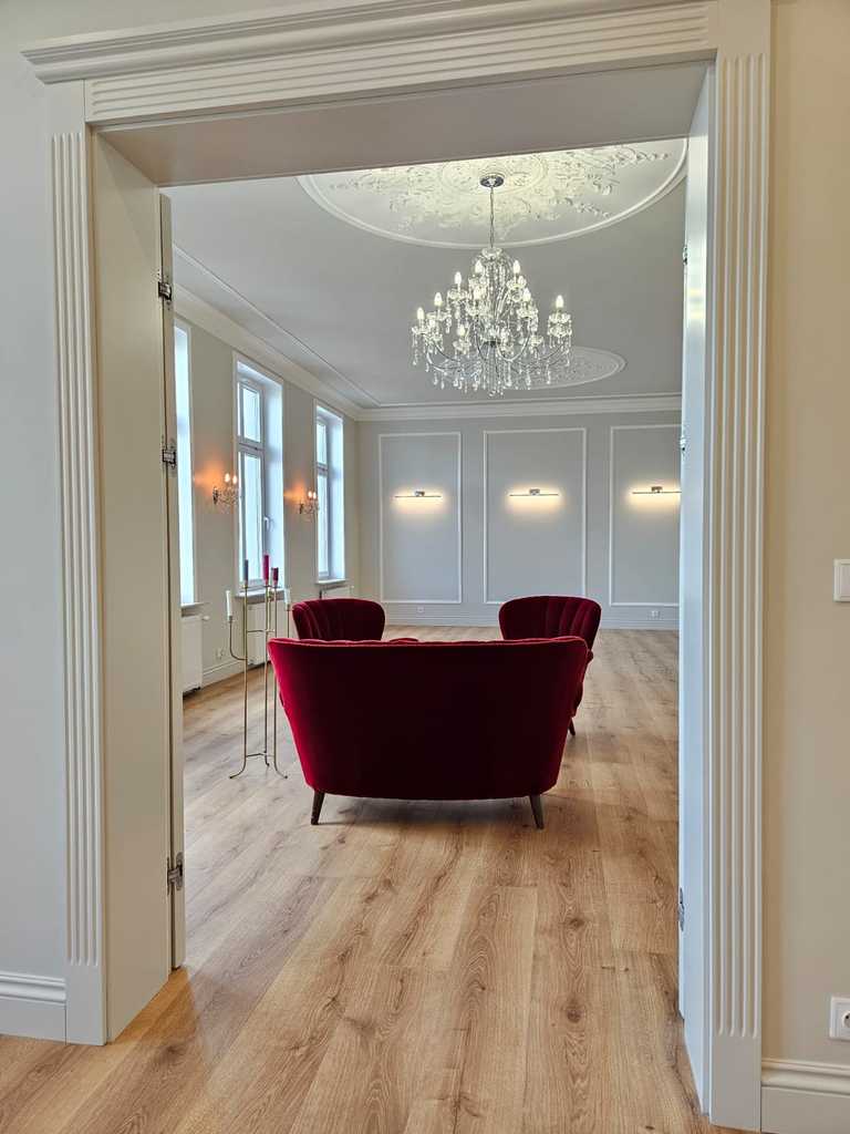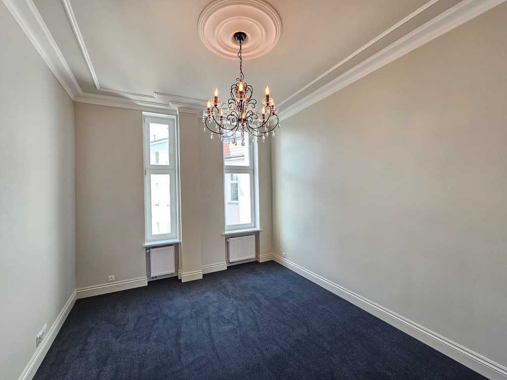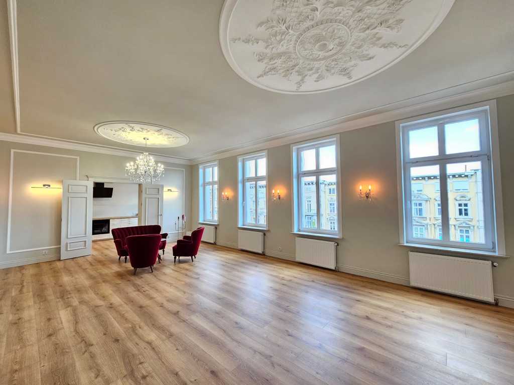 We have a unique offer of a beautiful apartment in a renovated tenement house located in a charming part of Śródmieście Szczecin. The residential premises with an area of 124.25 m2 in the land and mortgage register (due to the removal of a wall of approximately 130 m2) are located on the 3rd floor, close to Aleja Papieża Jana Pawła II. This is a representative part of the Center with tenement houses included in the register of monuments. Layout of rooms. A beautiful and huge living room of approx. 50 m2, created by combining two rooms, very well sunny thanks to four windows. A bedroom with an original preserved red brick wall, with space for a wardrobe and a passage to a private bathroom with a window. A smaller room serving as an office. From the living room there is access to a spacious, fully equipped kitchen. From the corridor we enter the second bathroom, with a new second-circulation gas furnace, a shower, a washbasin and a toilet. There are high-class panels on the floor, hotel carpets in the rooms and mosaics in the hall. Numerous plaster decors on the walls and ceilings give the interior an amazing atmosphere. Numerous wall lamps and crystal chandeliers emphasize the character of the apartment. Custom-made door joinery that will be appreciated by the most demanding customers. Everything is finished with the highest quality materials with attention to detail. The property has been completely renovated. Old plasters were removed and new, plastered walls and ceilings were installed, all electrical wiring, water and sewage installations were replaced, 20 cm wool and vapor-permeable foil were placed on the ceiling, just like in the property on the floor below, the floor in the bedroom and in the office was insulated and soundproofed with cotton wool. . Administrative rent of PLN 560 (rent PLN 210 + renovation fund PLN 348) including advance payments for cold water, staircase cleaning, garbage collection and renovation fund. The apartment has a large basement. The facade of the tenement house after renovation. If you are looking for a comfortable apartment in the city center, spacious, with beautiful stucco, we invite you to view this unique offer. Call and arrange a showing! We invite you!