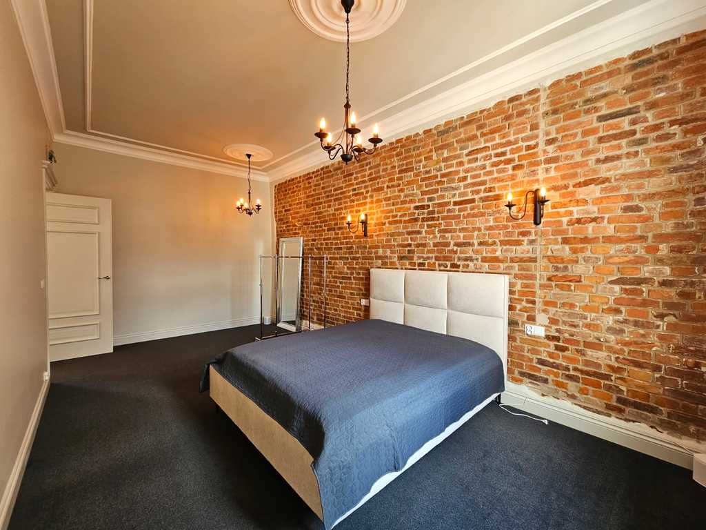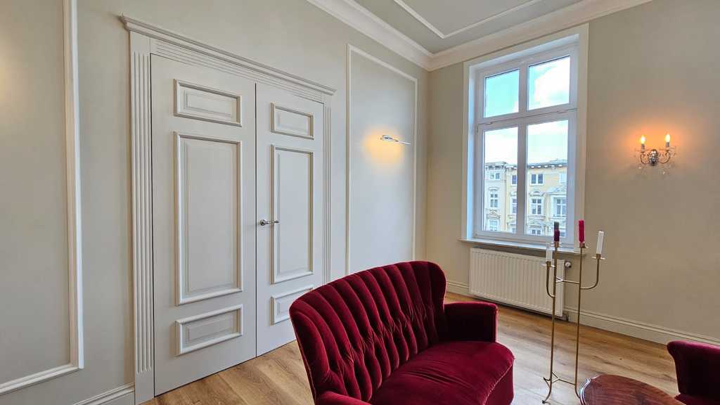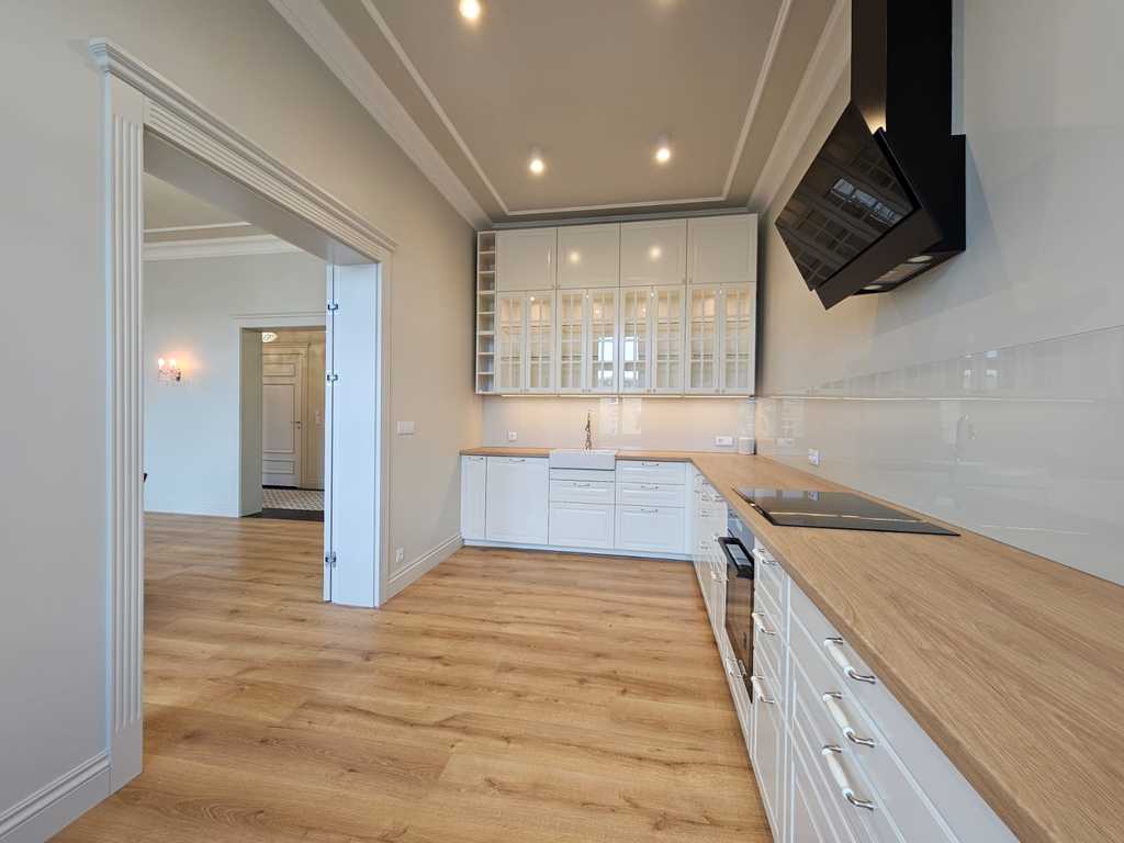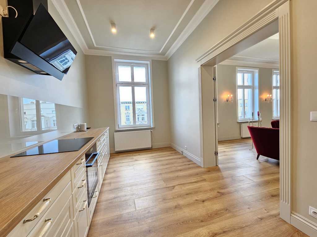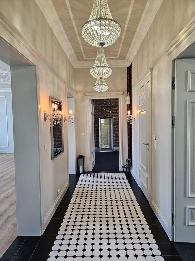 We have a unique offer of a beautiful apartment in a renovated tenement house located in a charming part of Śródmieście Szczecin. The residential premises with an area of 124.25 m2 in the land and mortgage register (due to the removal of a wall of approximately 130 m2) are located on the 3rd floor, close to Aleja Papieża Jana Pawła II. This is a representative part of the Center with tenement houses included in the register of monuments. Layout of rooms. A beautiful and huge living room of approx. 50 m2, created by combining two rooms, very well sunny thanks to four windows. A bedroom with an original preserved red brick wall, with space for a wardrobe and a passage to a private bathroom with a window. A smaller room serving as an office. From the living room there is access to a spacious, fully equipped kitchen. From the corridor we enter the second bathroom, with a new second-circulation gas furnace, a shower, a washbasin and a toilet. There are high-class panels on the floor, hotel carpets in the rooms and mosaics in the hall. Numerous plaster decors on the walls and ceilings give the interior an amazing atmosphere. Numerous wall lamps and crystal chandeliers emphasize the character of the apartment. Custom-made door joinery that will be appreciated by the most demanding customers. Everything is finished with the highest quality materials with attention to detail. The property has been completely renovated. Old plasters were removed and new, plastered walls and ceilings were installed, all electrical wiring, water and sewage installations were replaced, 20 cm wool and vapor-permeable foil were placed on the ceiling, just like in the property on the floor below, the floor in the bedroom and in the office was insulated and soundproofed with cotton wool. . Administrative rent of PLN 560 (rent PLN 210 + renovation fund PLN 348) including advance payments for cold water, staircase cleaning, garbage collection and renovation fund. The apartment has a large basement. The facade of the tenement house after renovation. If you are looking for a comfortable apartment in the city center, spacious, with beautiful stucco, we invite you to view this unique offer. Call and arrange a showing! We invite you!