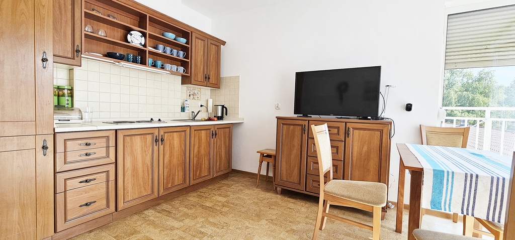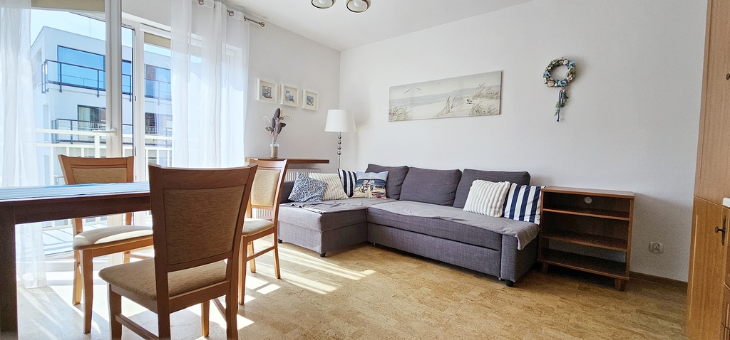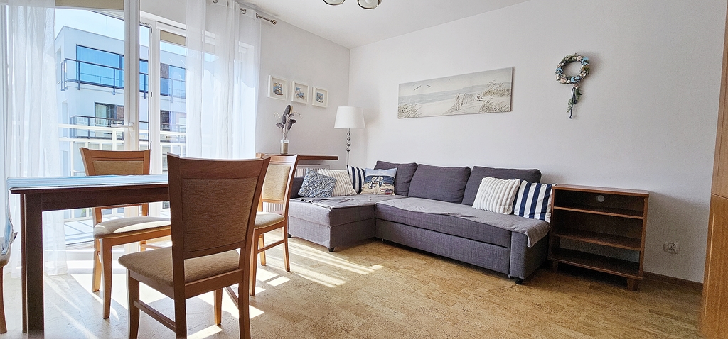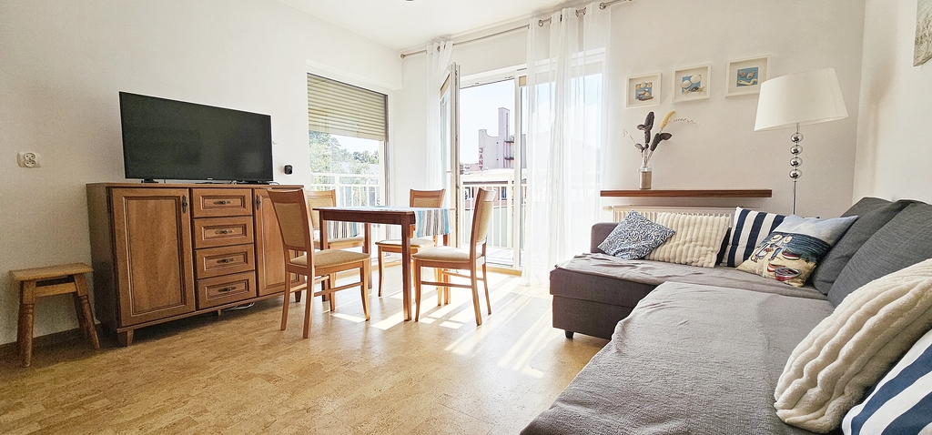 Exclusive offer! BUY, LIVE, RENT, EARN! ALL-YEAR-ROUND APARTMENT WITH A BEAUTIFUL TERRACE I will sell a 2-room apartment with a total area of 34.5 m2, fully equipped and furnished. This apartment is located on the 2nd floor of a building with an elevator, approx. 150 meters from the main entrance to the beach. It consists of: A spacious living room with an equipped kitchen, a bedroom, a bathroom with a shower, and two balconies. Heating and hot water come from the local network and are included in the rent. . It is sold fully furnished and equipped. The premises have residential status, which results in low maintenance costs (electricity in accordance with the household tariff, low real estate tax rate) and allows for purchase with a mortgage loan. It is possible to rent the apartment to an operator (there is no obligation to do so) who offers comprehensive services in the management and rental of real estate, you can also use the apartment for your own needs or rent it yourself. I invite you to a presentation – I have the keys.