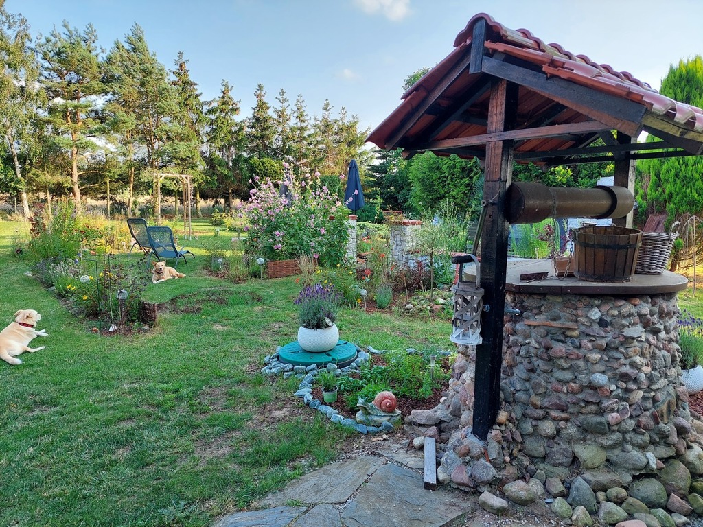 The house with an area of approx. 160 m2 has been completely renovated, thermal modernization has been carried out, new ceramic roof tiles, new windows, new heating installation, new interiors. The residential part consists of 4 rooms including a living room with a fireplace and a bedroom with a stove, a large, exclusive kitchen with new household appliances, two new bathrooms and a garage, a technical room. The property has been decorated in the Provencal style, high standard of finishing – photo.