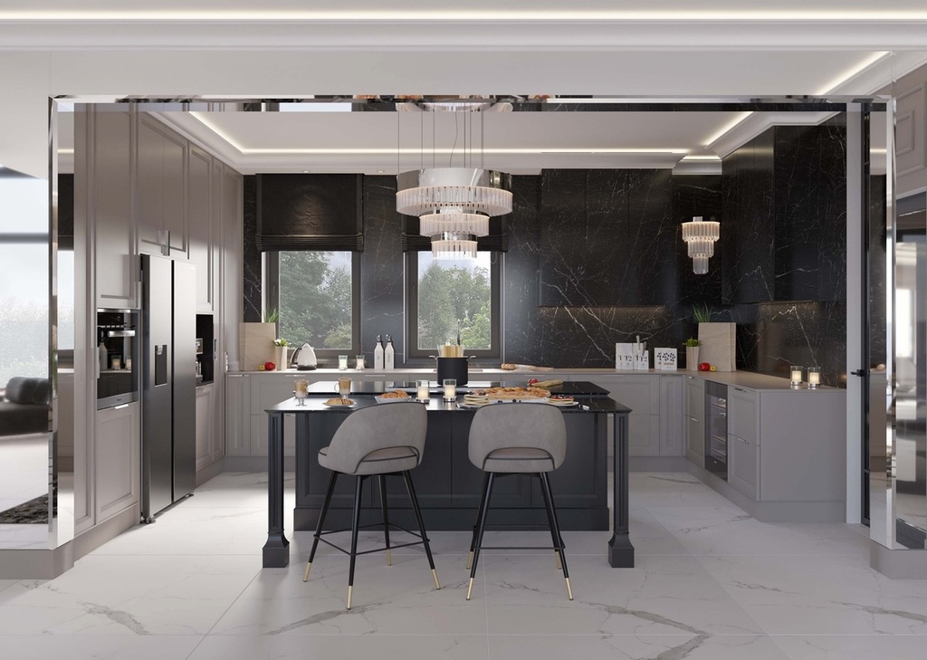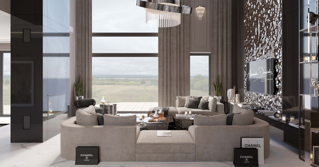 The living room flows smoothly into the open space where the kitchen and dining room are located, which are the heart of the house. Interestingly, this space is divided only by a double-sided fireplace that reaches all the way to the ceiling, giving a unique atmosphere to both the living room and the dining room. It is an ideal place to spend time together, cook and eat meals, where the glow of the fire adds warmth and charm to every meeting. You can also admire a beautiful view from the living room thanks to the mezzanine, which with its lightness contributes to the feeling of cozy space in this unique residence.