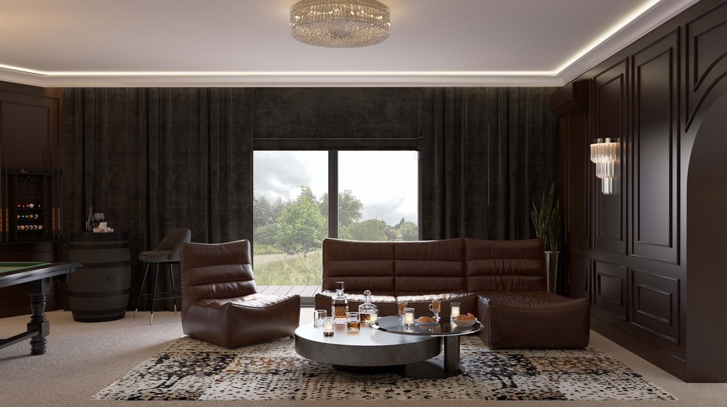 After passing the dressing room, we enter the main part of the house, where the first thing that catches our eye is a spacious living room with a panoramic window offering a view of the picturesque green areas and the Odra River. The height of this room at its highest point is 7.29 m, which adds to its impressive spaciousness.