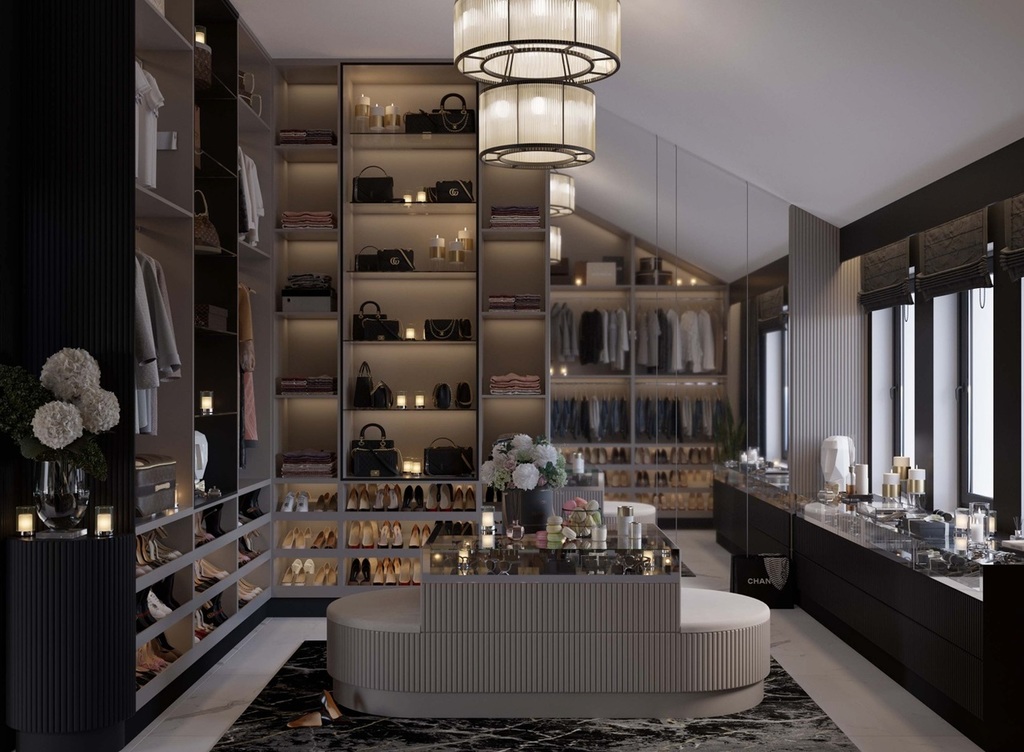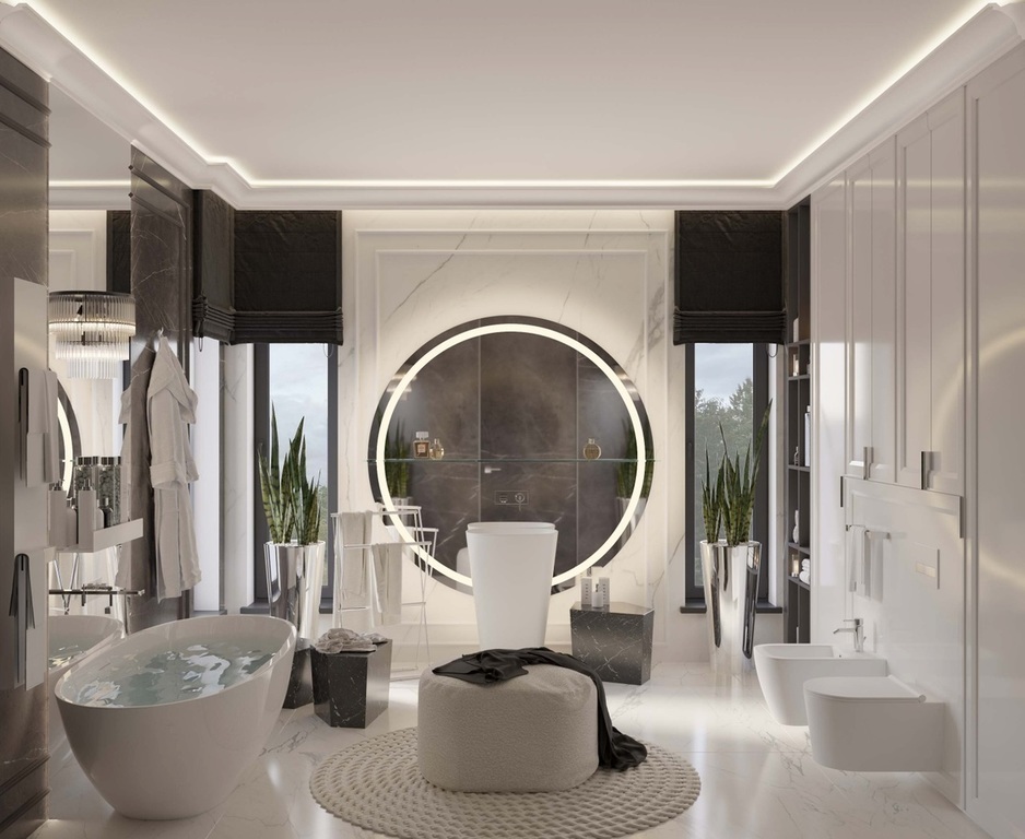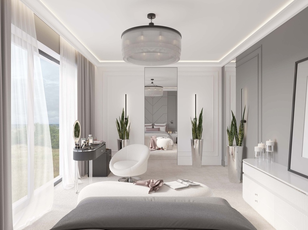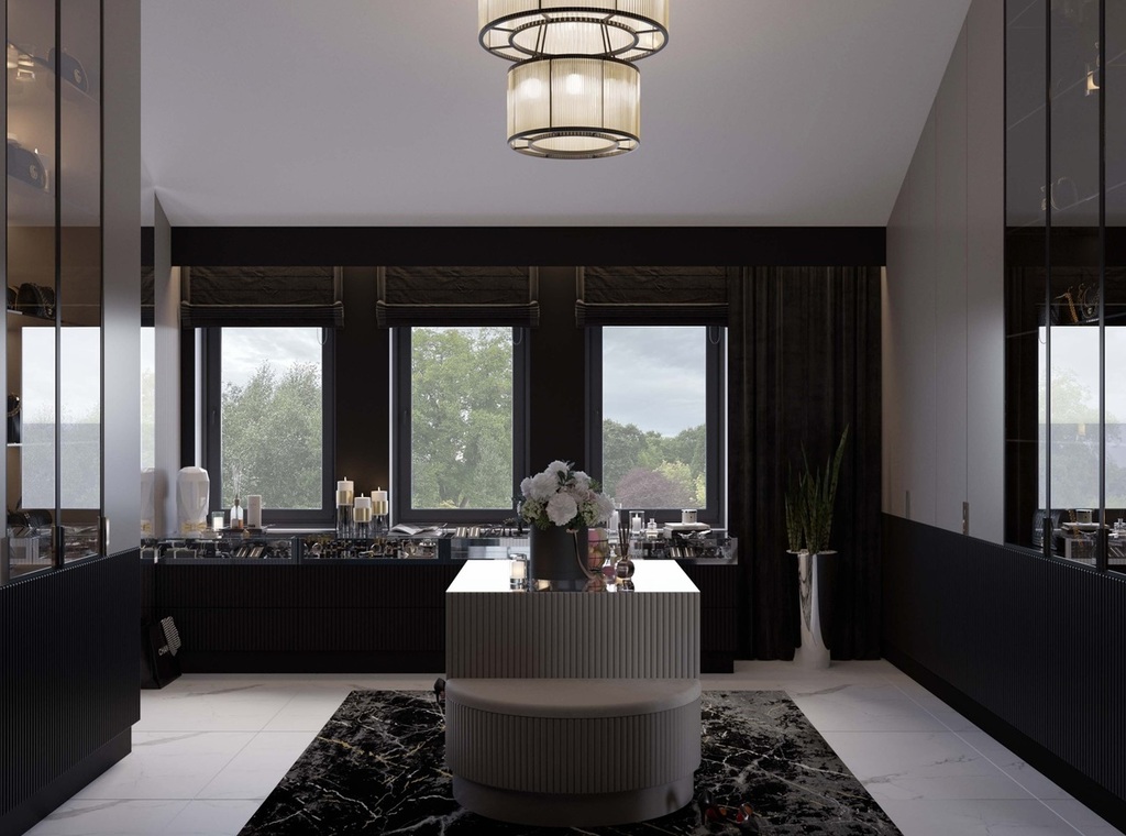 One of the two main bedrooms with an area of 20.81 m², located on the ground floor, to the right of the entrance and includes a large, luxurious bathroom with an area of 13.65 m² and a dressing room consisting of two connected rooms, equipped with elegant furniture. The first dressing room has an area of 10.80 m², the second one has an area of 11.95 m². This wardrobe allows you to divide it into women’s and men’s or summer and winter sections, as you wish.