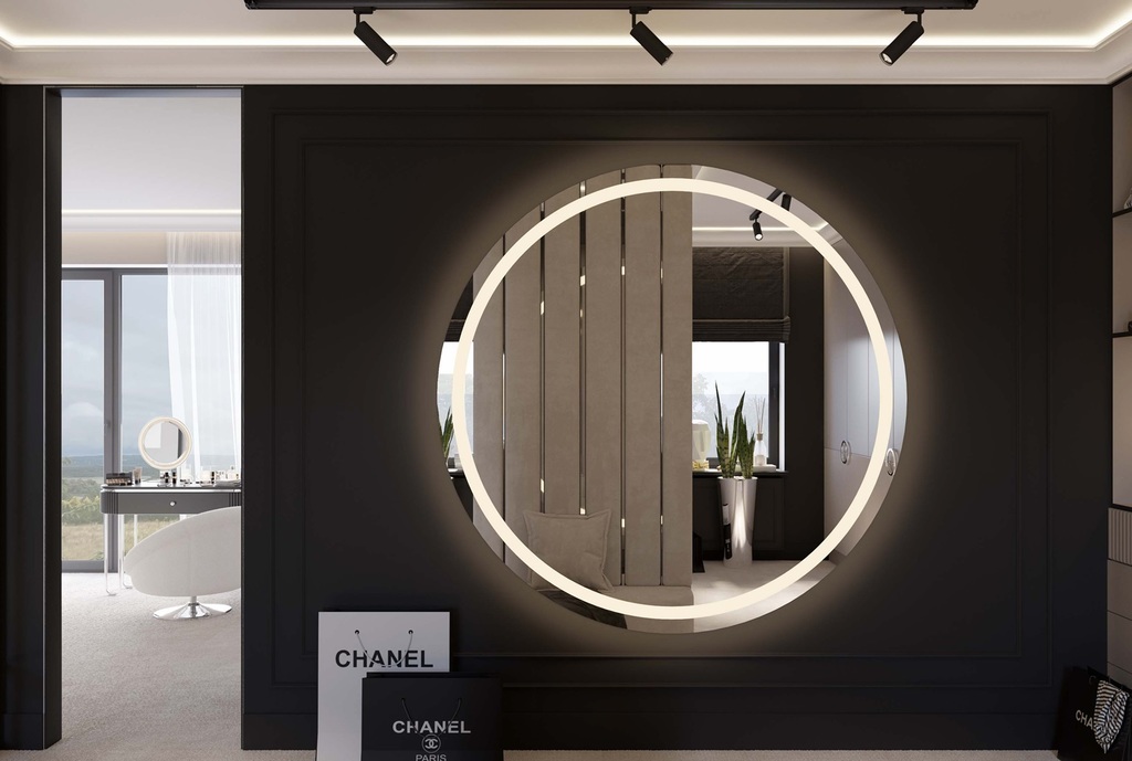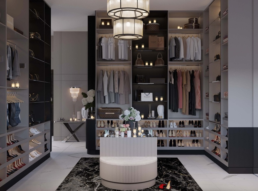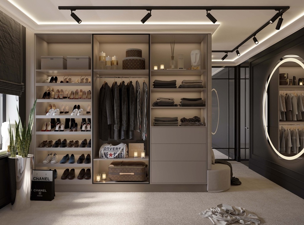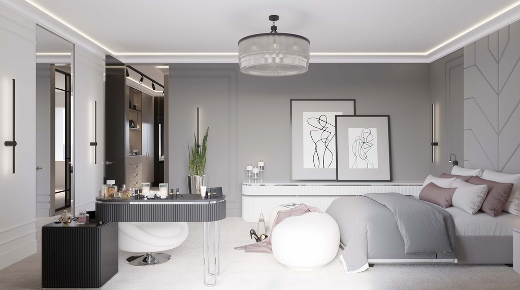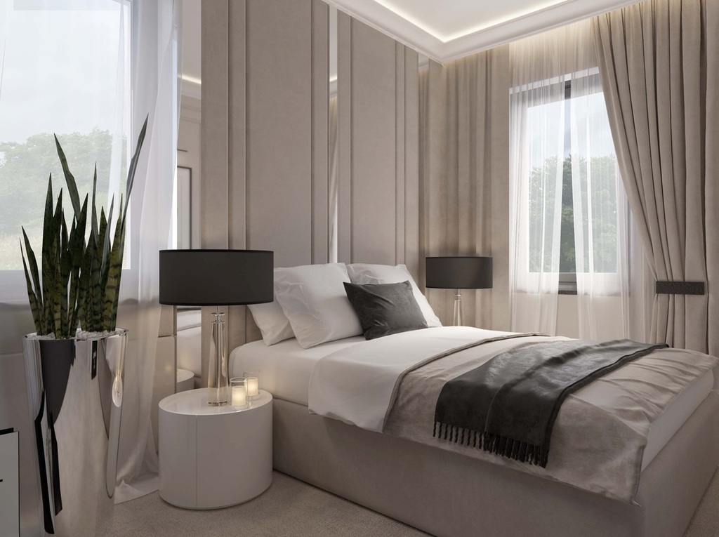 One of the two main bedrooms with an area of 20.81 m², located on the ground floor, to the right of the entrance and includes a large, luxurious bathroom with an area of 13.65 m² and a dressing room consisting of two connected rooms, equipped with elegant furniture. The first dressing room has an area of 10.80 m², the second one has an area of 11.95 m². This wardrobe allows you to divide it into women’s and men’s or summer and winter sections, as you wish.