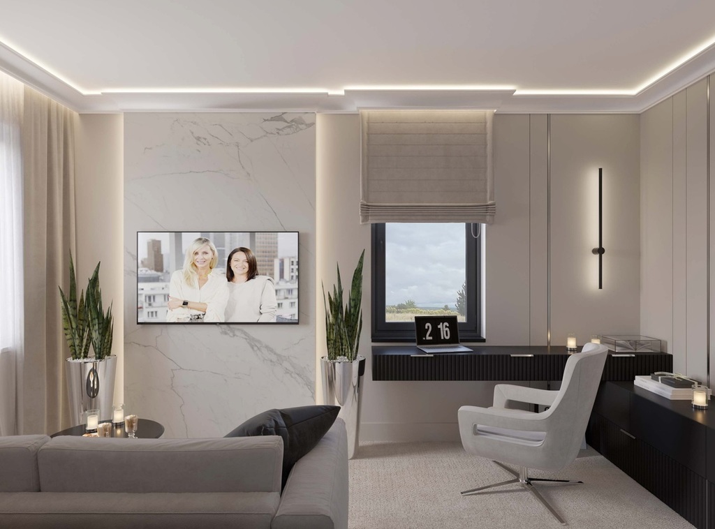 Additionally, on the mezzanine with an area of 21.15 m² there is a cinema room with an area of 21.31 m² can also be used as an additional room for a child. In the new design, it was transformed into a spacious wardrobe, providing an ideal place to store clothes and accessories.