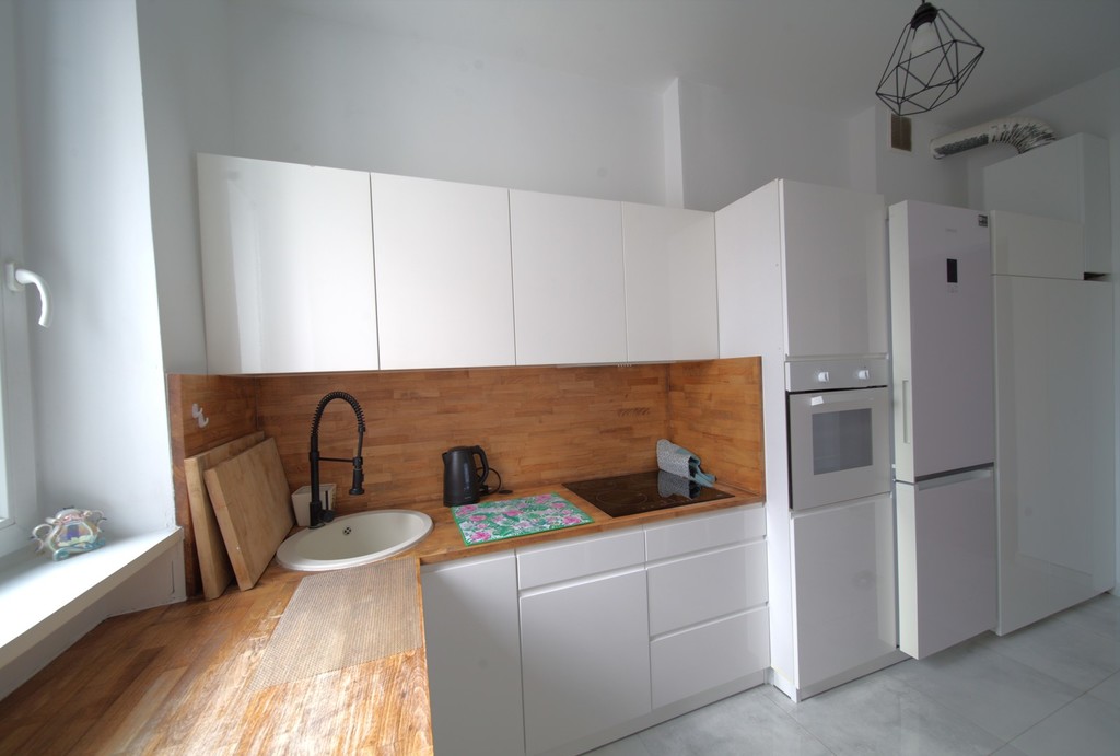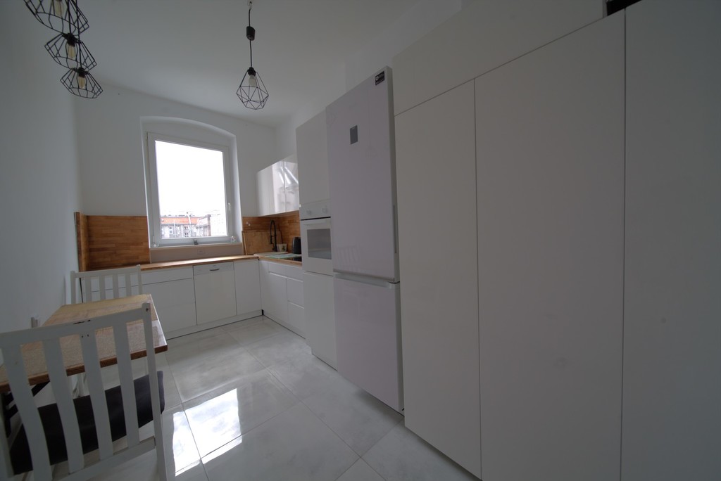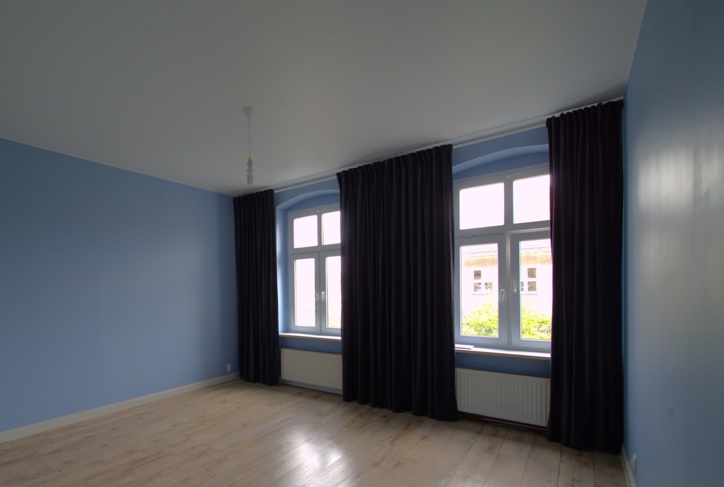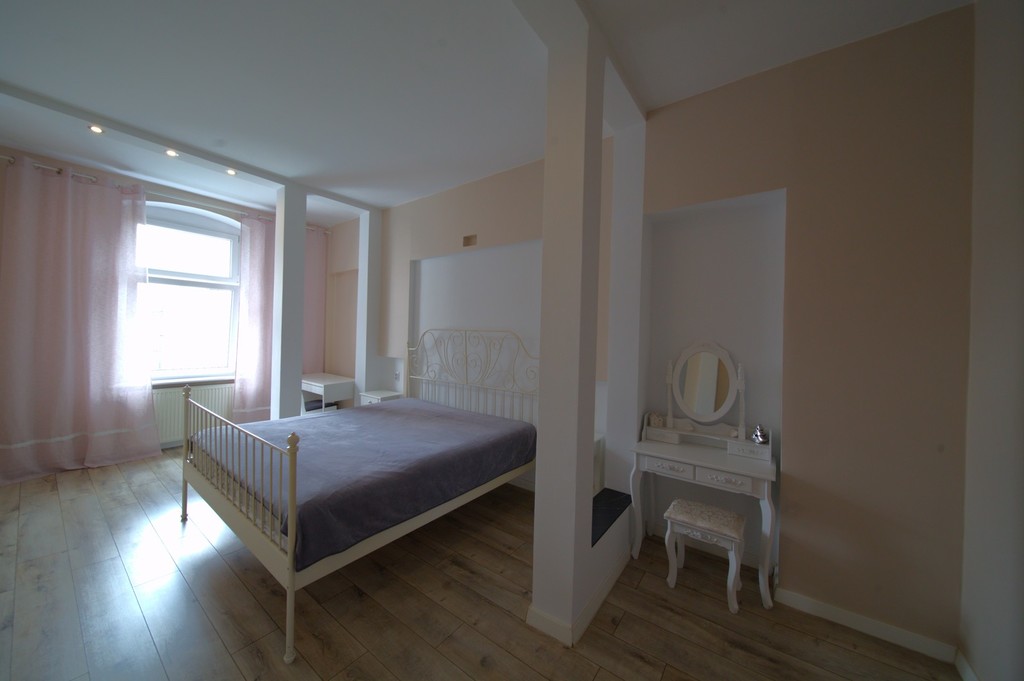 We invite you to familiarize yourself with the offer of an attractive three-room apartment with an area of 82.45 m2, located in the center of Szczecin at Królowej Jadwigi Street. Layout of rooms and standard of finish On the area of 82.45 m2 there are: three spacious rooms, a separate kitchen, a bathroom with a passage to the toilet and a hall. The apartment has been mostly renovated, only the bathroom with a toilet has been renovated. It is possible to demolish the wall between the bathroom and the toilet and make a larger bathroom, only there are small wooden windows to replace. The property is finished in an elegant and modern style. The windows have been replaced with PVC, new floors, painted walls. In one of the bedrooms there is a large built-in wardrobe, the second bedroom with a passage to a separate wardrobe. Kitchen with elegant furniture and household appliances. The apartment is warm and sunny, very well-kept and ready to move in. The furniture visible in the photos is included in the price. The apartment also includes a basement. Rent The rent is about PLN 500 and includes advances for cold water, renovation fund, garbage collection. Additionally, electricity and gas according to consumption. Heating and hot water from a two-circuit gas furnace. Building The apartment is located on the third floor in a tenement house from 1930. Currently, the elevation and staircase are being renovated. Parking spaces by the building – zone B. Attractive location The apartment is located in a great location in Szczecin – in the very center. In the area there are numerous shops, a shopping center, a school, a kindergarten, public transport. Investment The apartment is ideal for rent, both for students and employees. And also for a company headquarters or a photography studio.