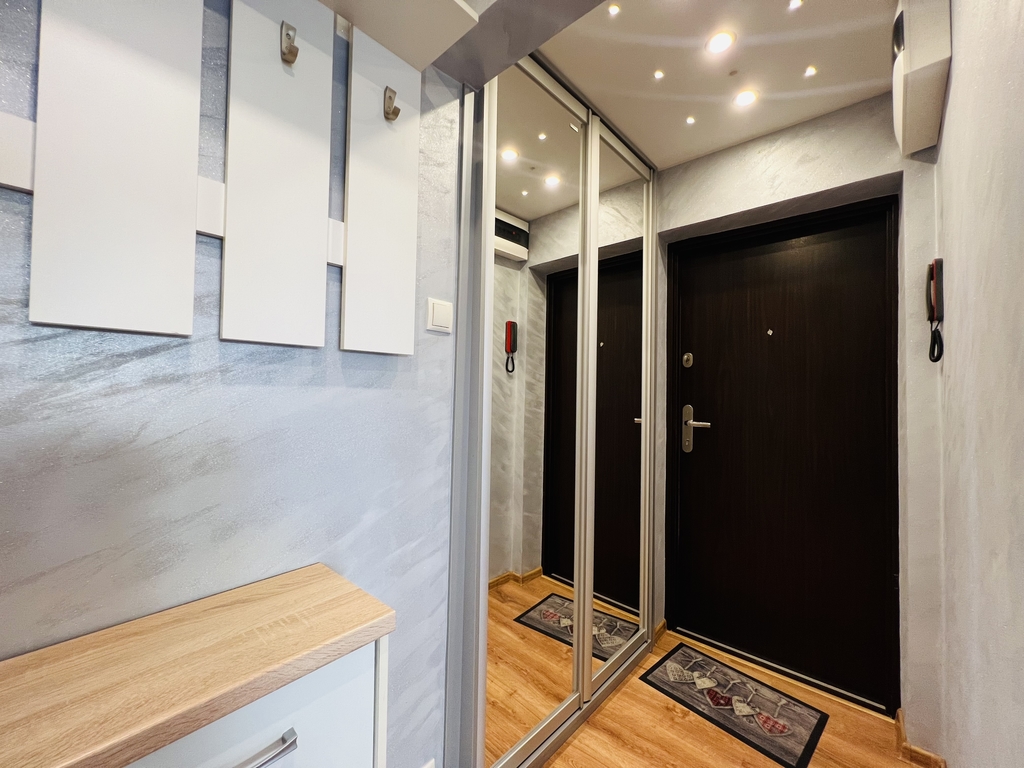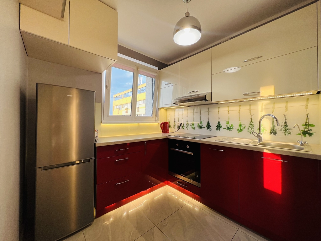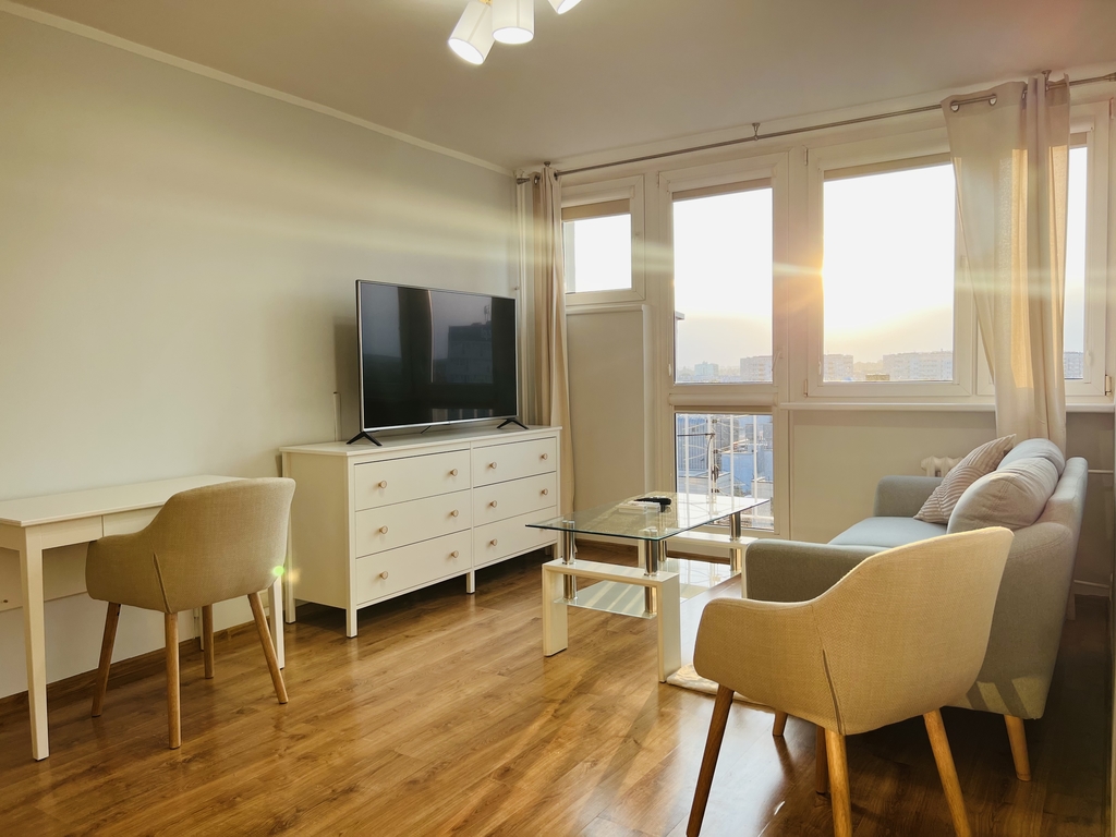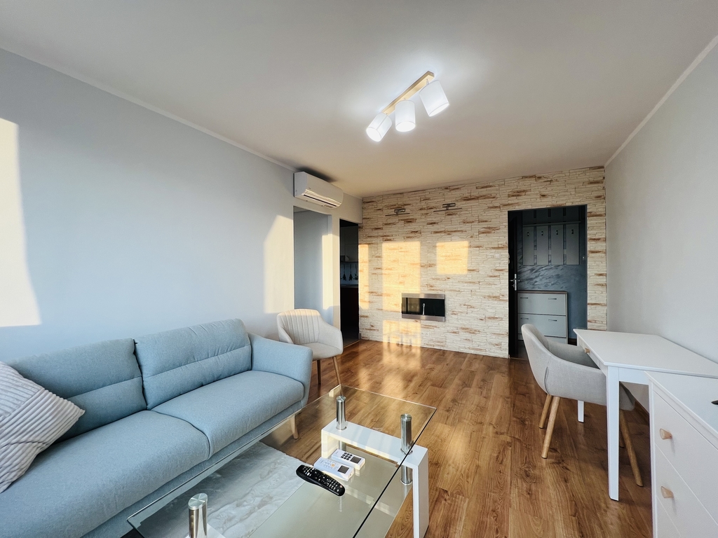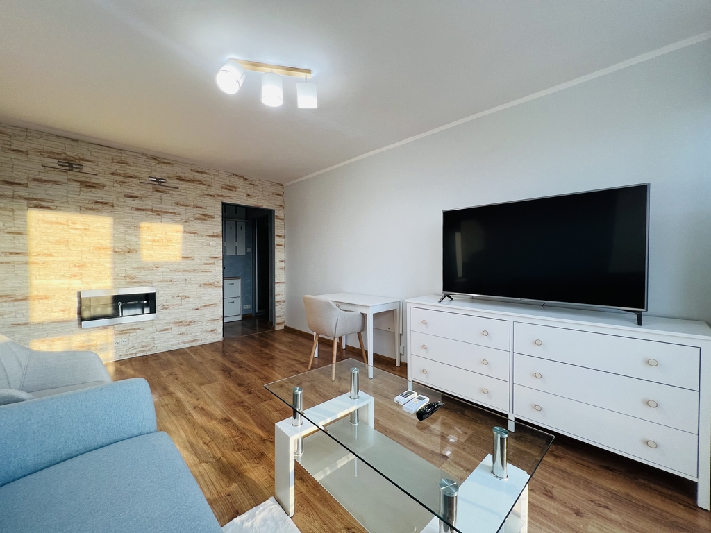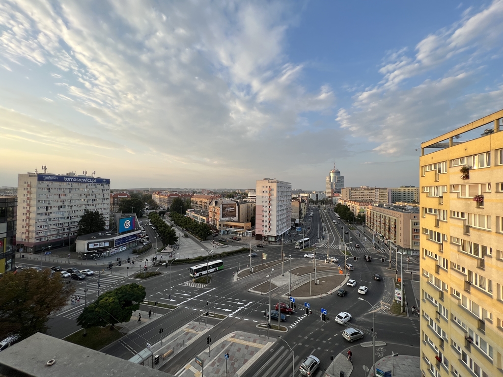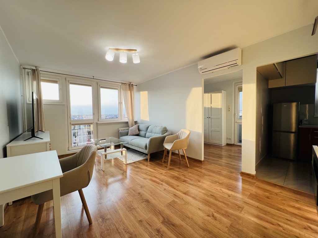 A cozy apartment for rent in a great location. LOCATION The apartment is located on the 9th floor of a high block in the very center of Szczecin. Entrance to the building with limited access (gate). Public transport nearby – tram and bus stops. Opposite the Kaskada shopping center. APARTMENT The apartment consists of: – a hall with a built-in wardrobe – a bright, spacious living room with a balcony window and a French balcony – a cozy bedroom with a large balcony window and a tiny balcony – a kitchen with household appliances and built-in furniture – a bathroom with a bathtub and a toilet . The interior is perfectly lit thanks to large windows and balcony doors. The apartment has recently been refreshed, the walls were painted and new furniture was purchased. Air conditioning provides pleasant coolness on hot days, and the fireplace provides a romantic atmosphere during autumn and winter evenings. A beautiful view of the city skyline is provided regardless of the season. The apartment includes a basement. ADDITIONAL INFORMATION – administrative rent – PLN 512 (for 2 people), includes advance payment for water and heating, FR, garbage collection – electricity – payable according to consumption – contract for a minimum of 12 months – occasional rental required – deposit – PLN 5,000 I invite you to the presentation .
