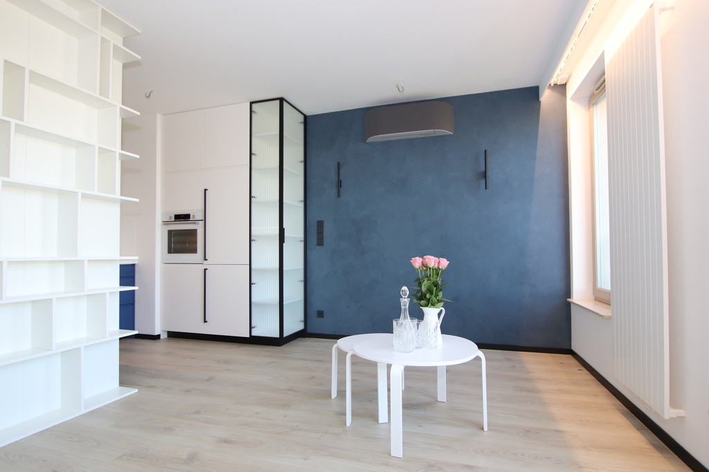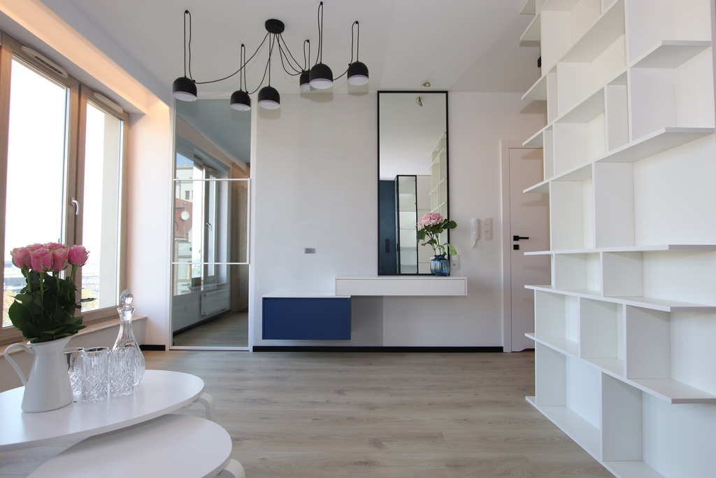 Living room: Large windows with a picturesque view of Old Szczecin. Modern finish makes the space bright and cozy.
