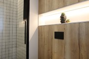 Bathroom with toilet: Spacious shower cabin with rain shower and numerous custom-made cabinets.