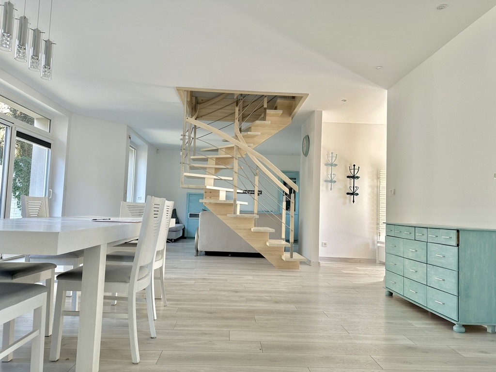 For sale a house with a beautiful view – in a prestigious district of Szczecin – Bezrzecze Location: House located in a quiet part of the district Very good communication with the city and proximity to infrastructure (shops, school, public transport). Area: House area: 180 m². Plot: 380 m², nicely developed with a garden, terrace and parking space on the property. Layout of rooms: Ground floor: Spacious living room with access to the garden. Dining room with entrance to the kitchen and descent to the ground floor. Toilet with window. Hallway with built-in wardrobe. First floor: Three large bedrooms. Bathroom with toilet. Second floor: Two bedrooms. Bathroom with toilet. Hallway with a large window. Entrance to the insulated attic. Ground floor: Utility room. Laundry room with side exit to the outside. Garage: Two-car garage with additional utility room above it (currently a gym). Extras: Bicycle room in the body of the building. Garden with remote-controlled entrance gate. Heating and hot water from a gas furnace, underfloor heating on the ground floor. Air conditioning in several rooms. Insulated and plastered house. Renovation: General renovation in 2018 (new electrical installation, floors, gas furnace). Area: Nearby: shops (Netto, Lidl, Biedronka), school, forest, gym, medical offices, public transport. An ideal offer for people looking for a comfortable, large house in a quiet area with excellent access to infrastructure. The property does not require any additional financial outlays!