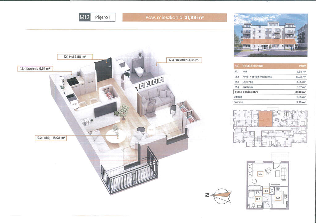The apartment in question is located on the FIRST FLOOR. It consists of a living room with a kitchenette with a total area of 18.08 m2, a bathroom of 4.35 m2 and a hall of 3.88 m2. The apartment includes a balcony of 2.85 m2 and a basement of 3.99 m2.