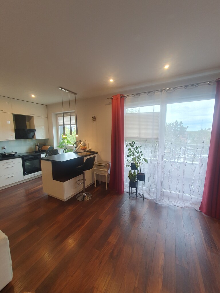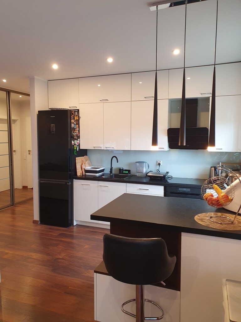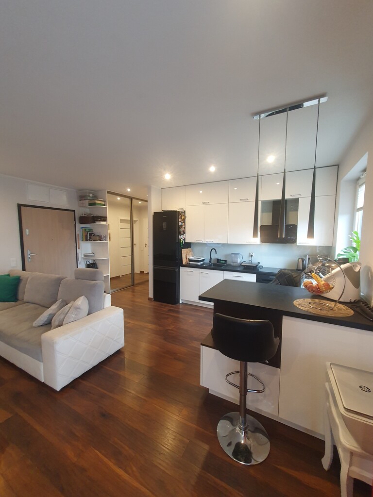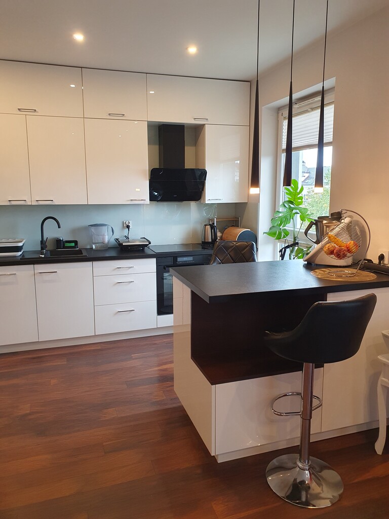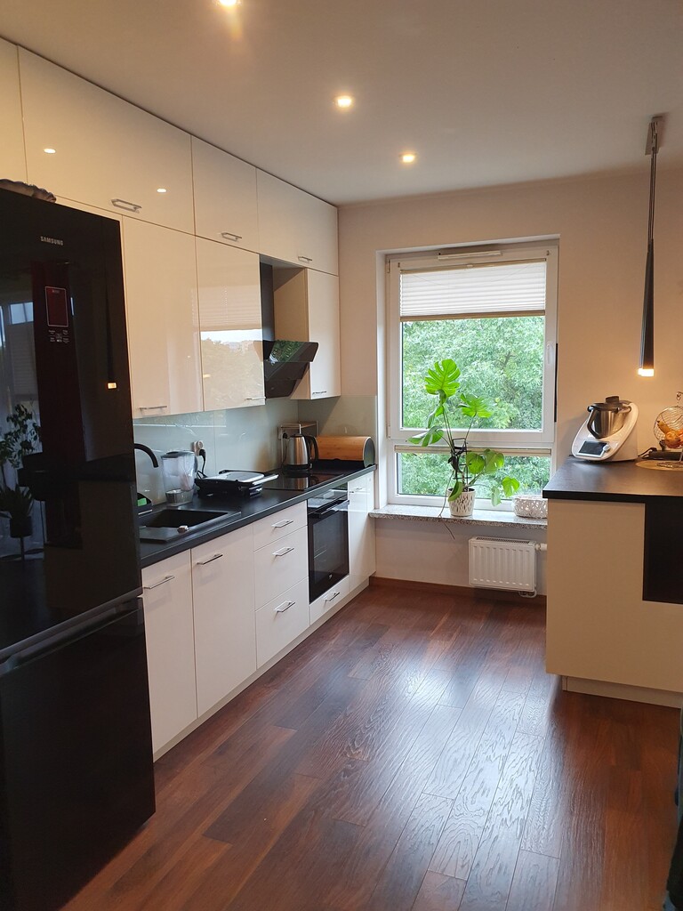 The annex consists of an island and a built-in kitchen equipped with household appliances such as an induction hob, cooker, hood, built-in dishwasher, free-standing refrigerator. The apartment includes a private parking space (cost PLN 30,000), and a storage room (cost PLN 10,000). The rent is approx. PLN 380 + heating from the city network + electricity.