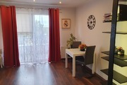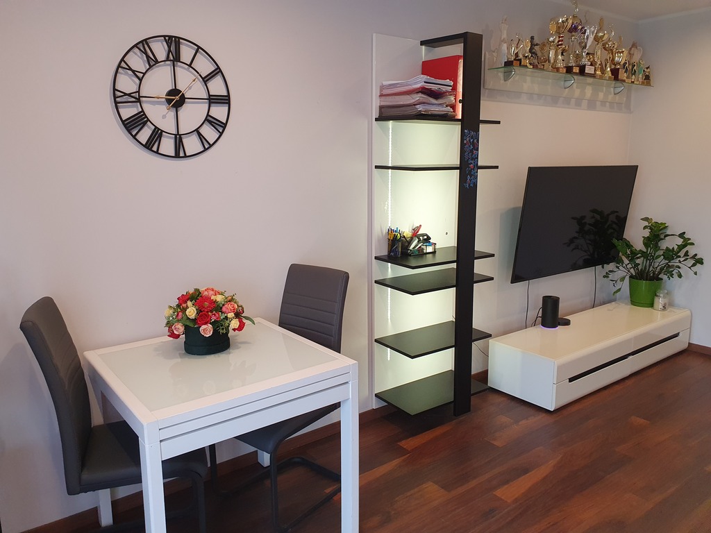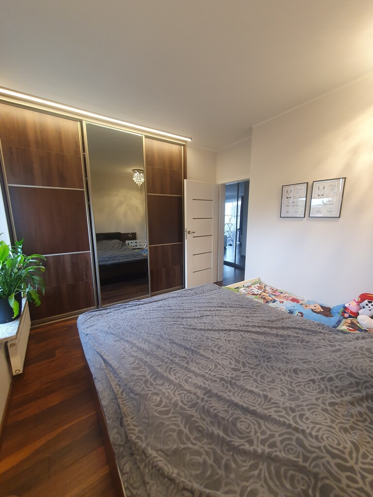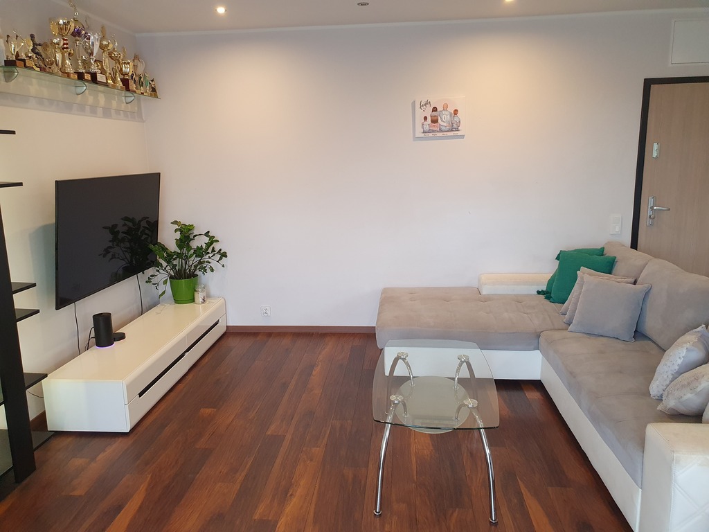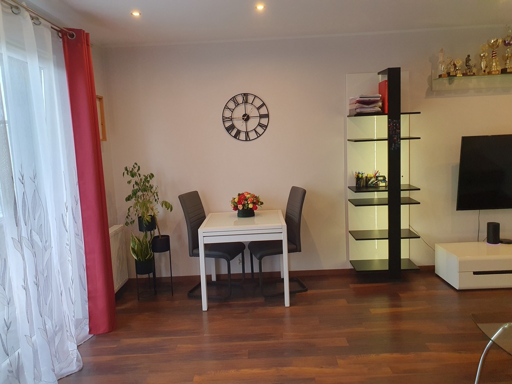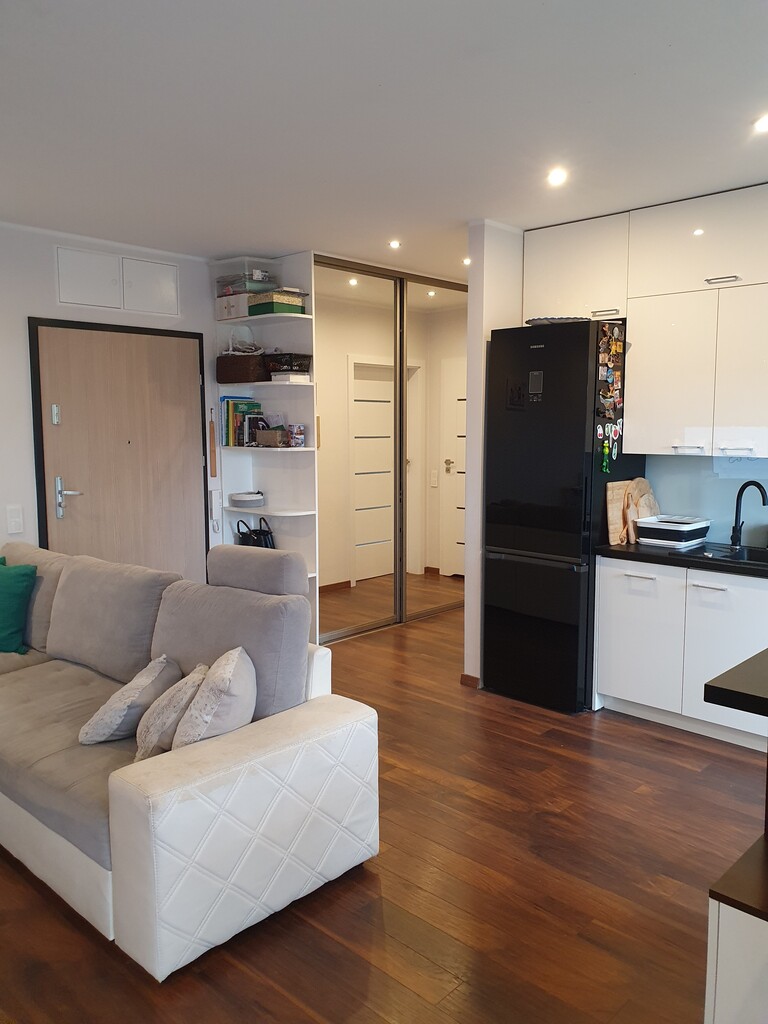 The annex consists of an island and a built-in kitchen equipped with household appliances such as an induction hob, cooker, hood, built-in dishwasher, free-standing refrigerator. The apartment includes a private parking space (cost PLN 30,000), and a storage room (cost PLN 10,000). The rent is approx. PLN 380 + heating from the city network + electricity.