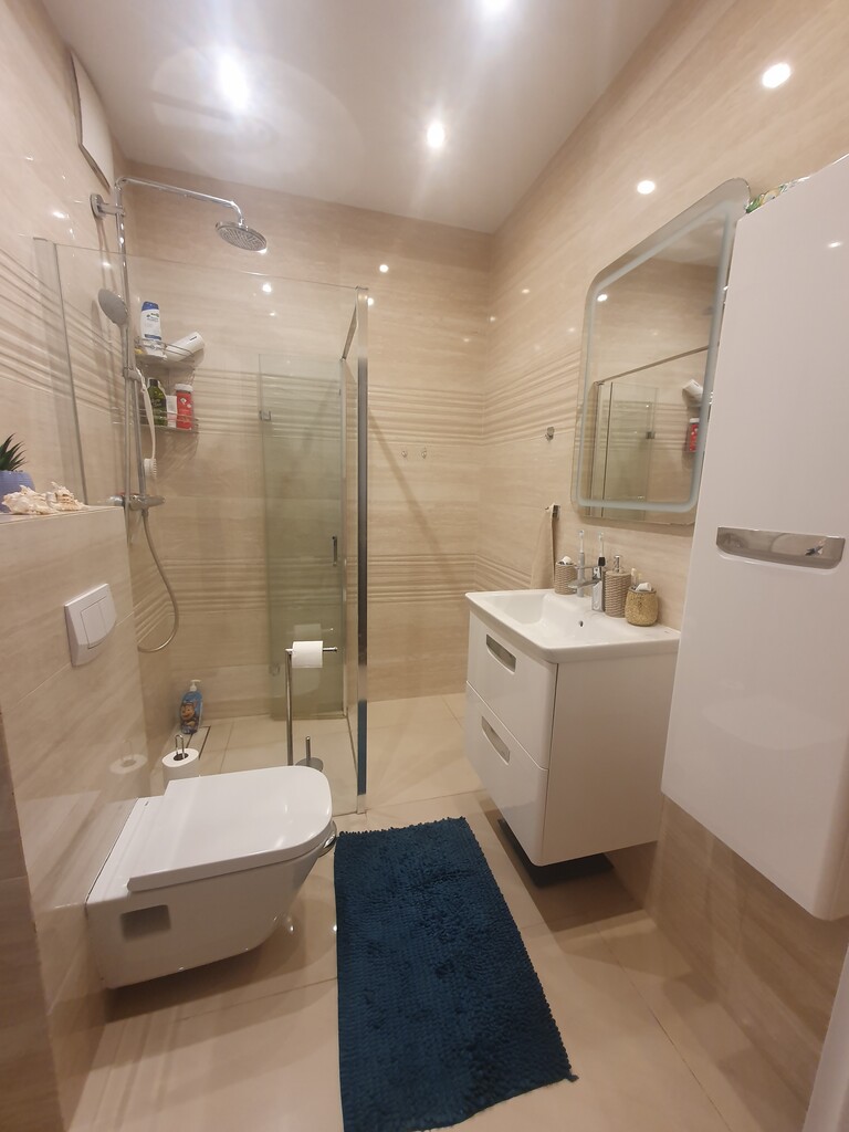 The bathroom has a shower with a linear wall drain and a rain shower, an over-counter washbasin, a built-in Geberit toilet, a large mirror, a bathroom cabinet, a washing machine and above it two built-in cabinets for detergents and laundry.