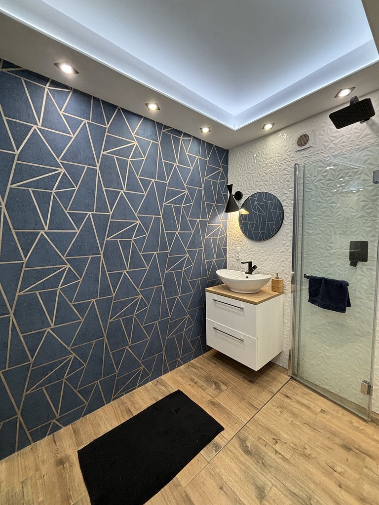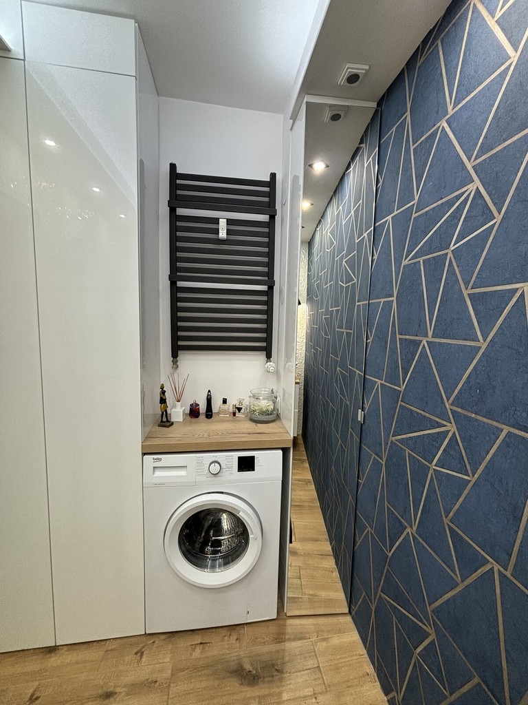 -Bathroom (4.28 m²) – comfortable, with a shower with folding glass doors, built-in cabinets, and a washing machine.