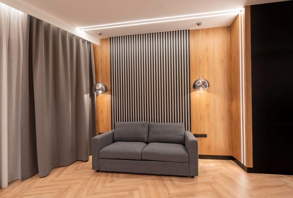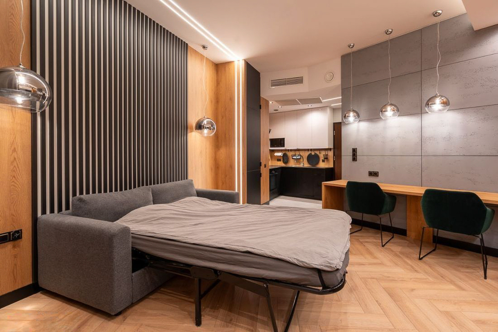 Modern interior: Elegant interior design, combined with innovative solutions, such as an Italian bed frame, which allows for maintaining order and spaciousness, creates a unique atmosphere. Despite its small size, the apartment is very spacious and comfortable.