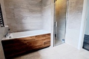 * a large bathroom with a bathtub and shower is located centrally