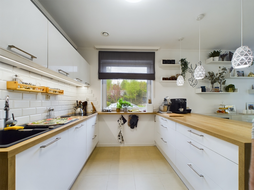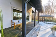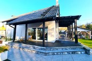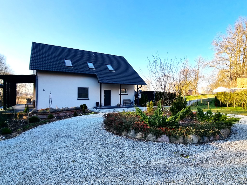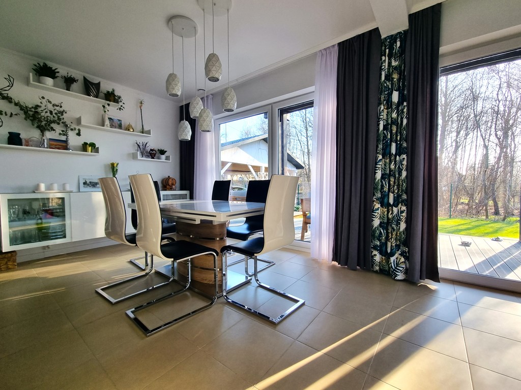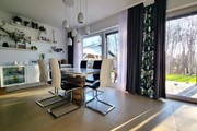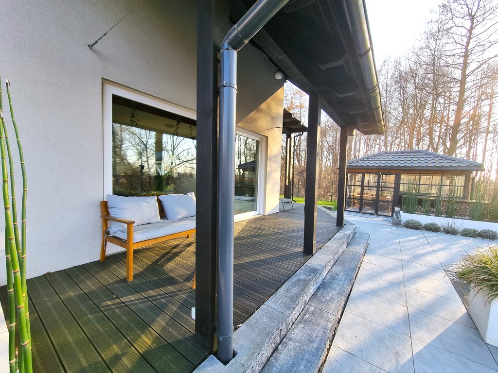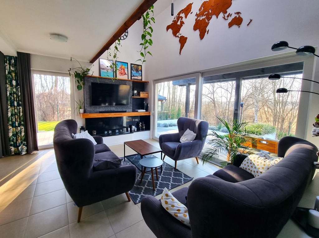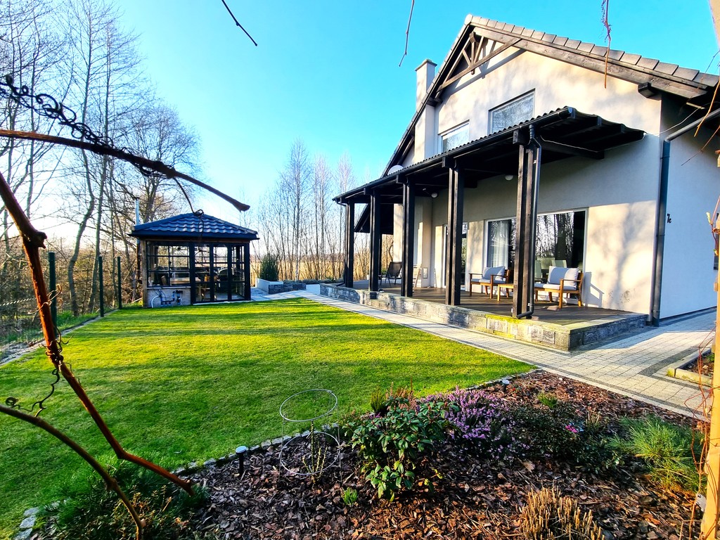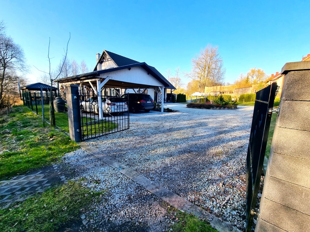 For sale an extraordinary and functional detached house in a great location in Nowe Brynki! If you value: – Bright, large living room topped with a mezzanine – Well-lit rooms – Interiors finished with high-class materials selected by professionals – Quick access to the provincial city We have an offer for you! A house built using prefabricated wooden frame technology on a reinforced concrete foundation slab. An incredible advantage of the property is its surroundings, it is not a housing estate and therefore we can see a green landscape behind the large windows from the living room. Underfloor heating has been distributed throughout the entire apartment, a fireplace with a connection to a water jacket is located in the living room. After crossing the gate, we are greeted by a wisely developed area, a separate carport for cars, a summer kitchen, a tool shed, and a bicycle shed. In addition, the owners have not forgotten about small architectural elements that please the eye. This is a truly unique place to fall in love with. I invite you to the presentation!