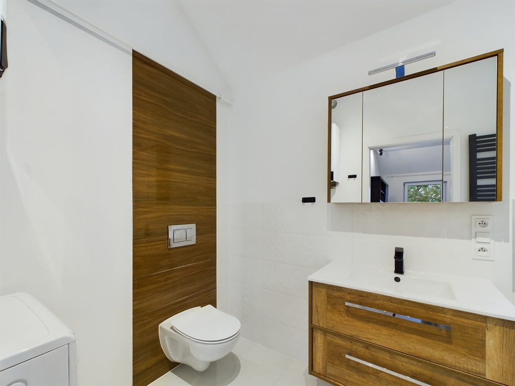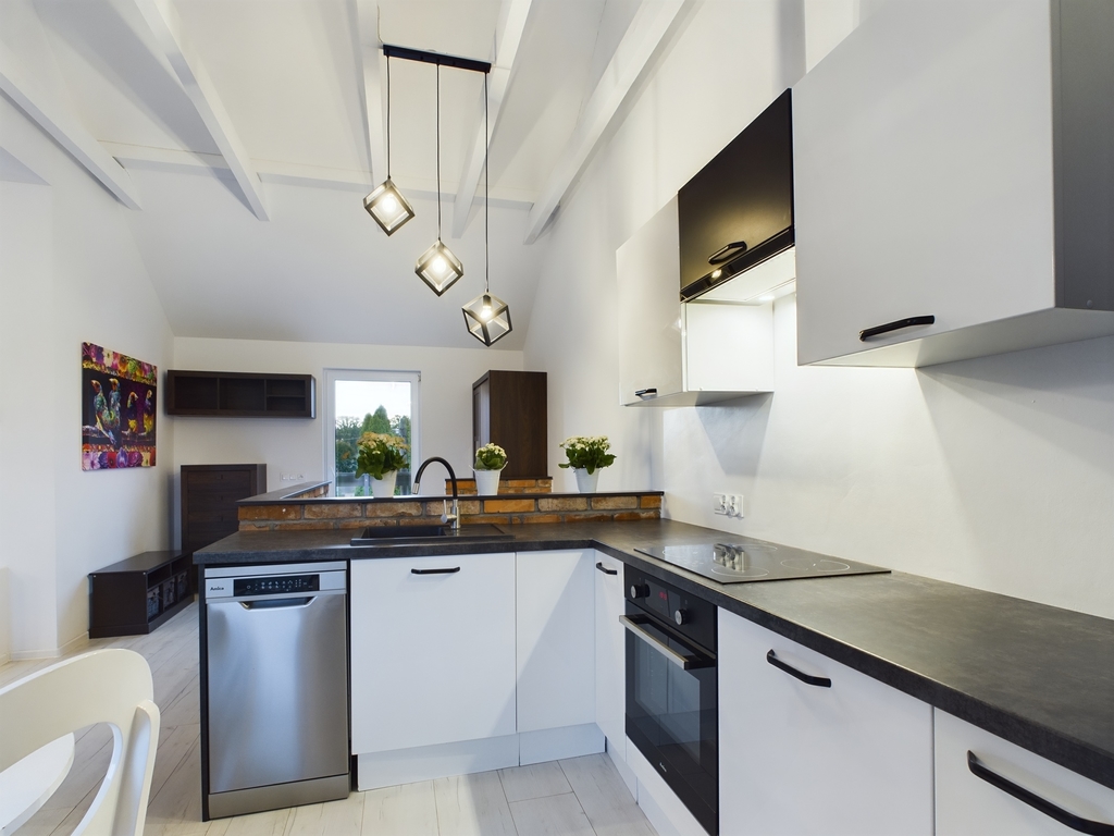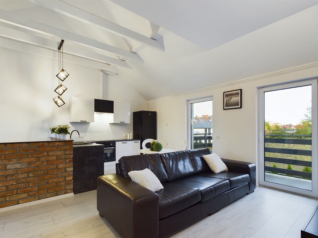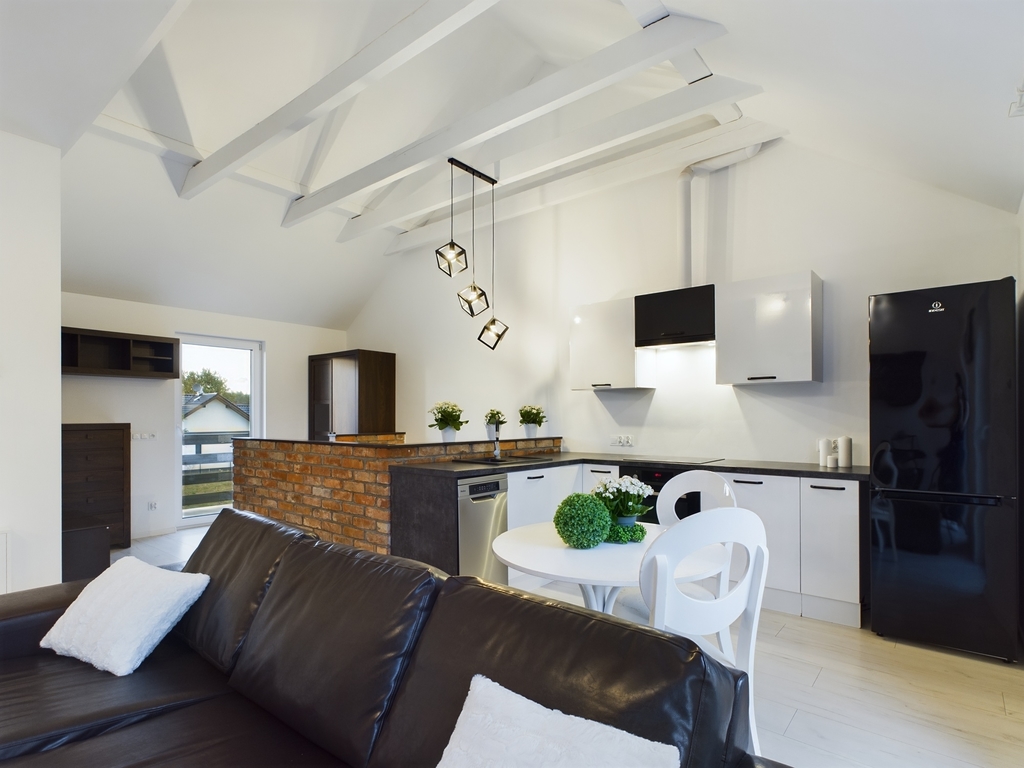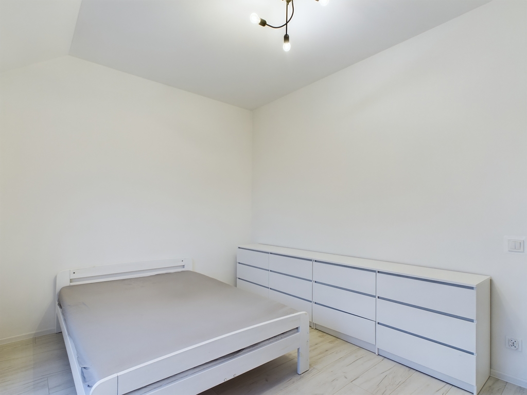 We invite you to familiarize yourself with the offer of a beautiful apartment with an area of 61.44 m2 with two balconies and a parking space for two cars, located in Police Jasienica. Layout of the rooms The apartment is accessed by stairs from the corridor on the ground floor. On the first floor there are: – a spacious living room in the form of an open space with an open kitchen and access to two balconies – on two sides of the apartment, – a bright bathroom with a bathtub, washbasin and toilet and a ladder radiator – a bedroom with access to the balcony – a room Additionally, an unused attic for storing things. Standard of finish and equipment The apartment is in perfect condition – it does not require any financial outlays. Elegantly and stylishly finished. Equipped and ready to move in. In the kitchen, built-in furniture with household appliances: dishwasher, fridge-freezer, hood, oven, induction hob. In the living room, a seating set and cabinets. In the bedroom, a large bed, desk and chests of drawers. In the bathroom, a washing machine. Triple-glazed windows with electric blinds – controlled by remote control. Underfloor heating in the living room with kitchen, bathroom and hallway. Radiators in the bedrooms. Media and fees Heating and hot water from a gas condensing furnace. RENT-FREE apartment! Electricity, gas and water according to consumption. Very low fees due to the high standard of insulation and windows. Additionally, garbage collection. Internet and TV on your own. Building The property is located on the first floor in a single-family semi-detached two-apartment house – built of Porotherm in 2021. The property is fenced and located in an intimate place. The apartment includes two parking spaces – entry through a gate opened by remote control. At the back of the building a garden of approx. 100 m2 for your own use. Location In the immediate vicinity of a school, kindergarten, clinic, pharmacy, shops. Communication – city bus. To the center of Police approx. 9 km, to the center of Szczecin 21 km. This beautiful apartment is waiting for its new owner. Don't hesitate and schedule a presentation. I sincerely recommend and invite you!