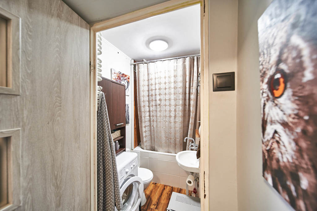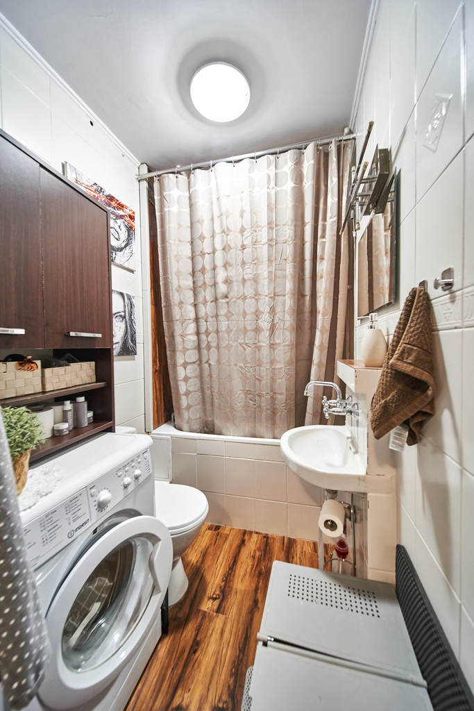 The hallway offers ample storage with a built-in wardrobe and additional cabinets above the bathroom entrance. The bathroom is fitted with a bathtub, toilet, sink, washing machine, and practical cabinets. The floors throughout the apartment are covered with panels and tiles, ensuring durability and easy maintenance.