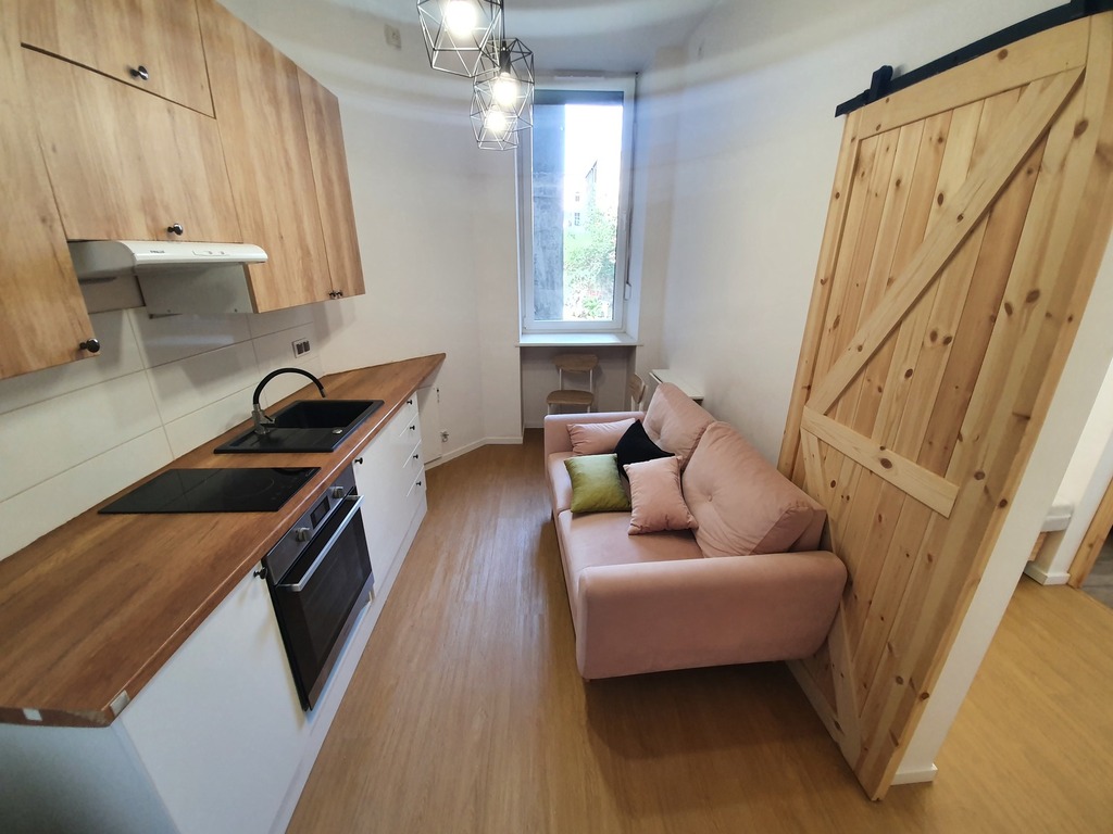 For rent immediately a beautiful studio with a separate bedroom space at ul. Jagiełły in Szczecin. Apartment on the ground floor. Fully furnished apartment. Kitchen in the form of a kitchenette with an oven and fridge and an induction hob. Bathroom with washing machine, shower cubicle and sink. In the living room there is also a sofa and a fold-out desk. There is also a tall wardrobe. Additional costs are 600 flat-rate for utilities (for 2 people + 150 PLN) including heating, water, Internet!. Deposit 2500 PLN. We invite you 🙂