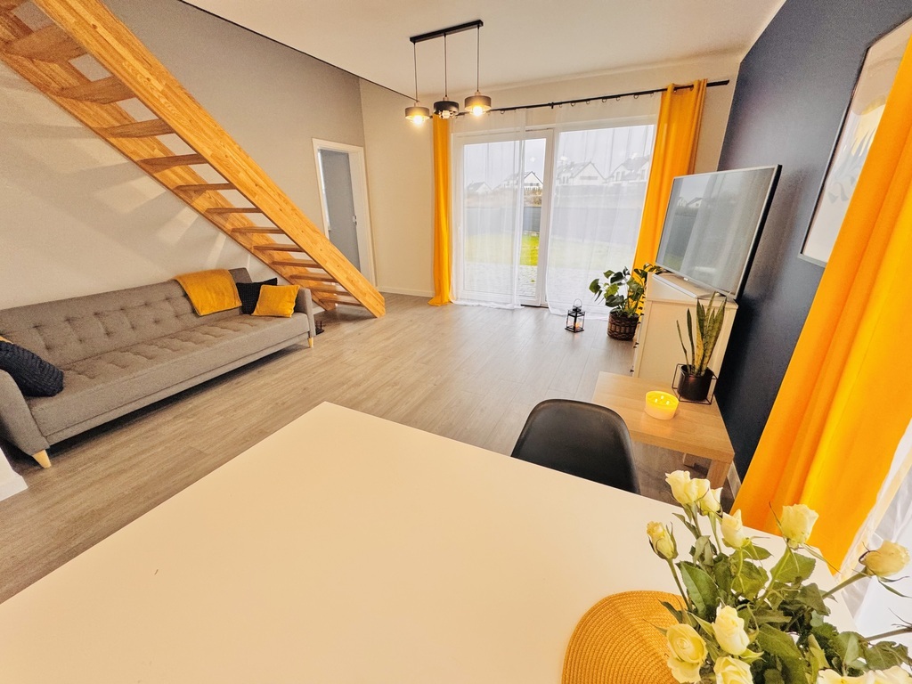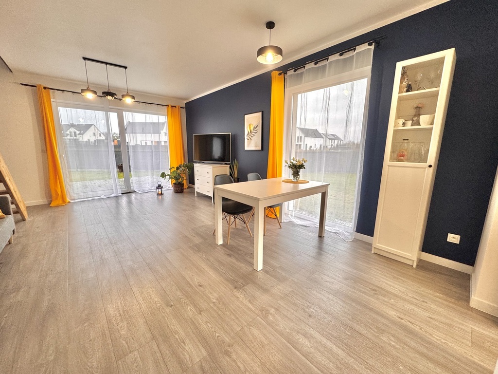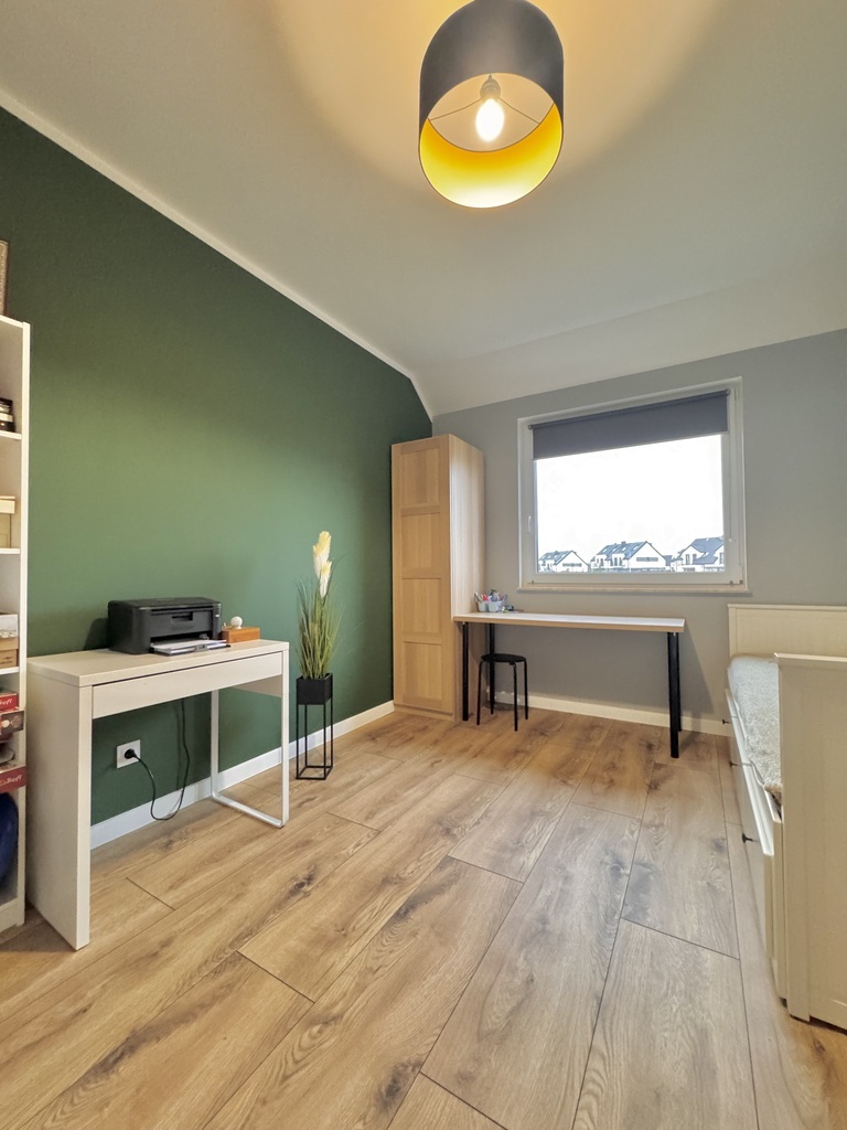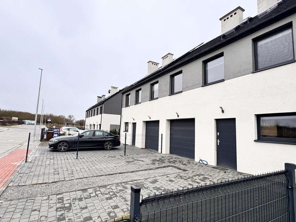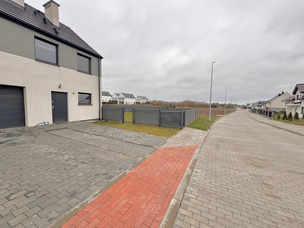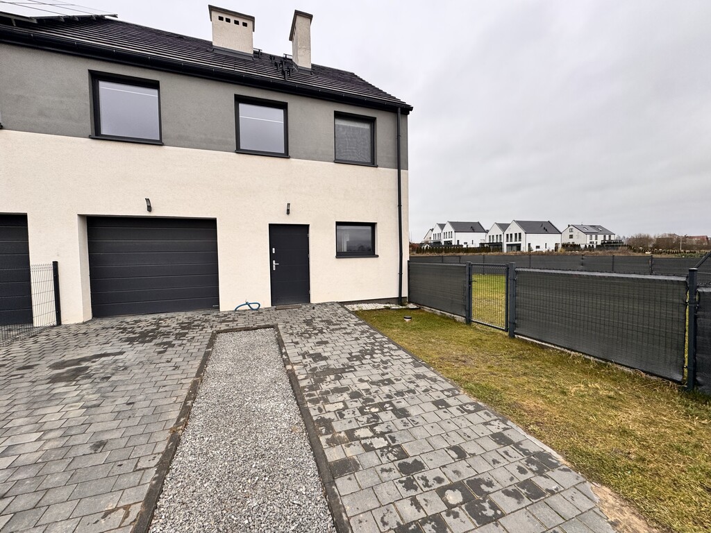 For sale an extreme semi-detached house in Warzymice from 2022 located on a plot of 460 m2. No slopes! The property has a garage in the body of the building with an area of approx. 17 m2. Fenced plot. Possibility of parking 3 cars in front of the building. The house is very sunny, with a view of the garden and single-family housing. A huge advantage is the peace and quiet due to the lack of neighbors from the side of the garden and terrace of the building. Access and driveways to the building made of concrete blocks. Municipal access road, lit. The property is noteworthy due to the quick access to Szczecin and also in the immediate vicinity of a kindergarten and school. The area of the premises of approx. 112 m2 consists of: Ground floor: – garage approx. 17 m2 with a Wiśniowski gate, – hall approx. 4 m2, – living room (approx. 25 m2) with exit to the terrace and garden approx. 400 m2, – room/study approx. 6 m2, – high-quality kitchen with household appliances (approx. 5 m2), – toilet approx. 1 m2. A beautiful wooden staircase leads to the first floor of the property. 1st floor: – hall approx. 11 m2 – room approx. 17 m2 (can be returned to its original state and converted into two rooms), – bedroom (approx. 12 m2), – bedroom (approx. 8 m2), – bathroom with bathtub – shower (approx. 7 m2). Above the first floor, an unused attic with retractable stairs. Other information about the property: Internet and TV installations distributed in the building. Heating and hot water via an individual heat pump – air (economical maintenance of the house). Underfloor heating on the ground floor and on the first floor. Double wall between premises. Gable roof covered with ceramic roof tiles (insulated). PVC windows and balcony doors, 3 panes. Doors to the terrace in a sliding system. Sectional garage door, automatically controlled. Garage additionally insulated. Sewerage and city water. On the plot, rainwater tanks with water distribution to the lawn. Low maintenance costs of the property. The equipment of the property is almost entirely included in the price of the property. EXCLUSIVE I invite you to the presentation.
