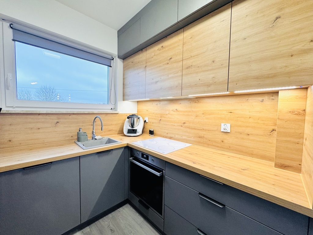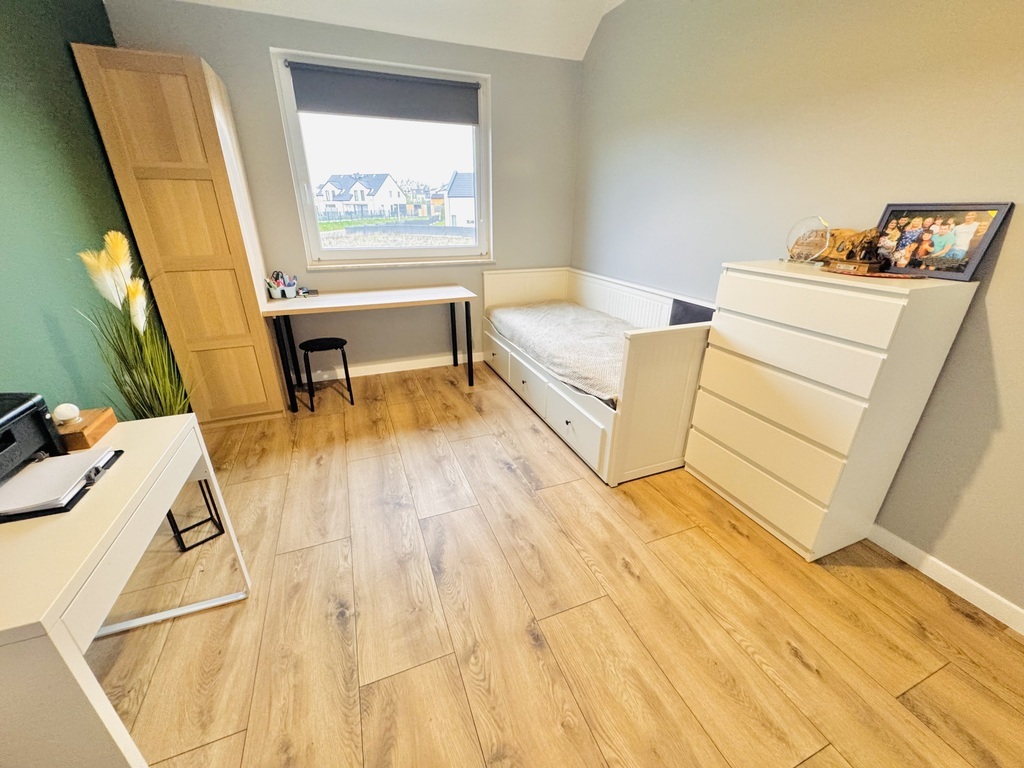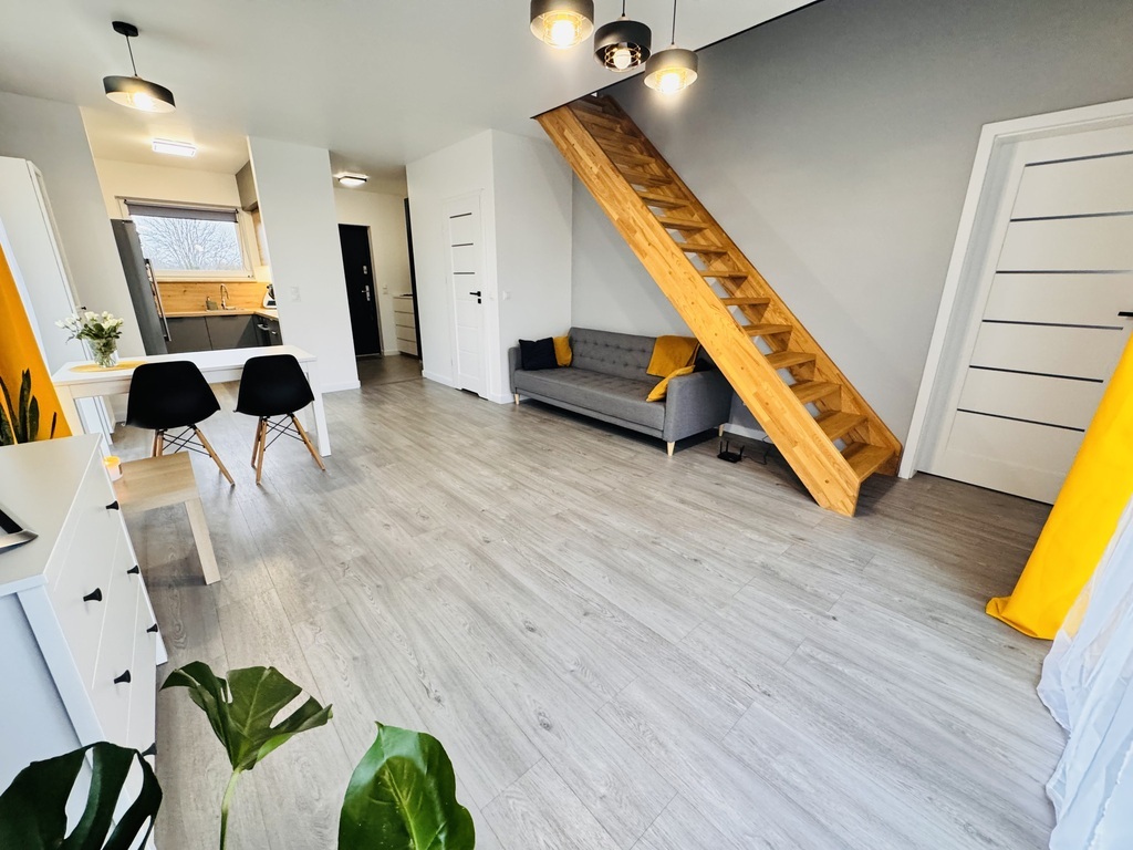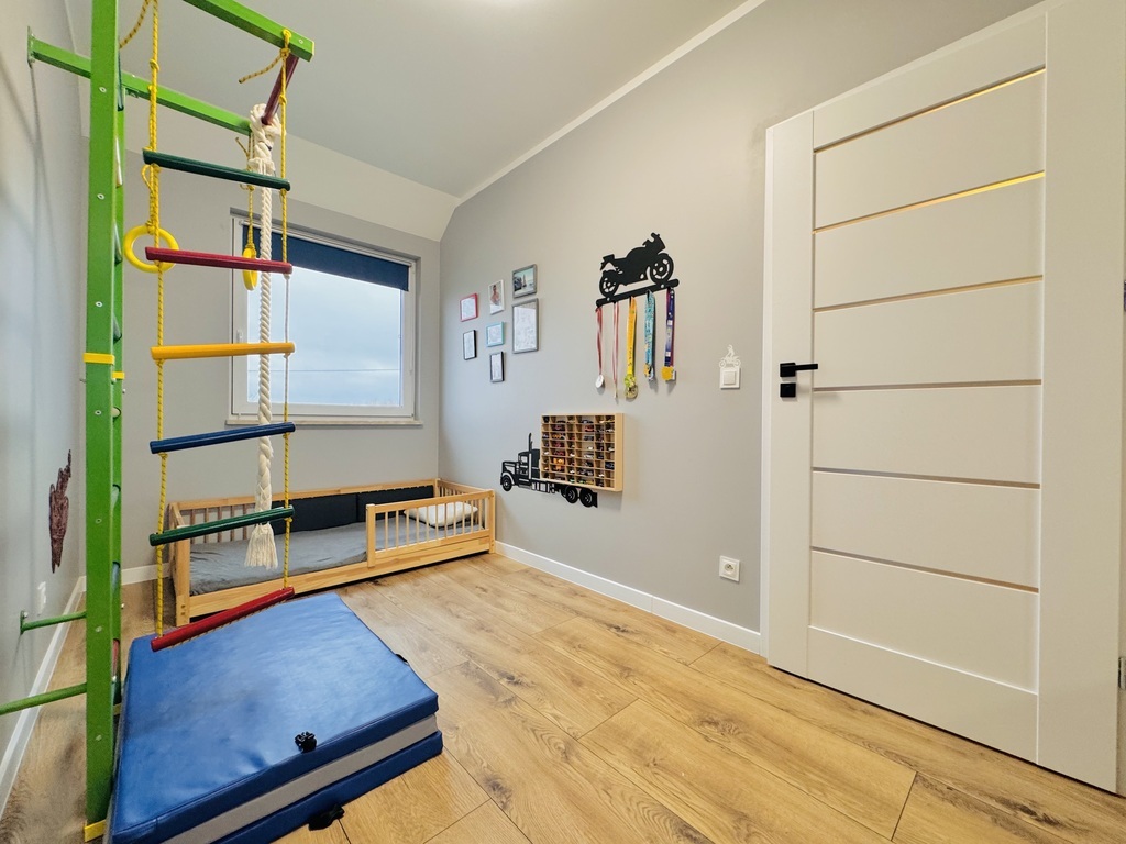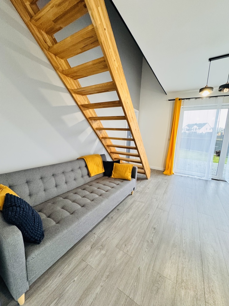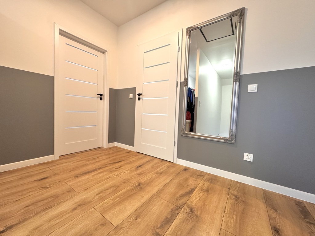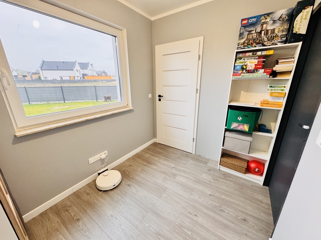 For sale an extreme semi-detached house in Warzymice from 2022 located on a plot of 460 m2. No slopes! The property has a garage in the body of the building with an area of approx. 17 m2. Fenced plot. Possibility of parking 3 cars in front of the building. The house is very sunny, with a view of the garden and single-family housing. A huge advantage is the peace and quiet due to the lack of neighbors from the side of the garden and terrace of the building. Access and driveways to the building made of concrete blocks. Municipal access road, lit. The property is noteworthy due to the quick access to Szczecin and also in the immediate vicinity of a kindergarten and school. The area of the premises of approx. 112 m2 consists of: Ground floor: – garage approx. 17 m2 with a Wiśniowski gate, – hall approx. 4 m2, – living room (approx. 25 m2) with exit to the terrace and garden approx. 400 m2, – room/study approx. 6 m2, – high-quality kitchen with household appliances (approx. 5 m2), – toilet approx. 1 m2. A beautiful wooden staircase leads to the first floor of the property. 1st floor: – hall approx. 11 m2 – room approx. 17 m2 (can be returned to its original state and converted into two rooms), – bedroom (approx. 12 m2), – bedroom (approx. 8 m2), – bathroom with bathtub – shower (approx. 7 m2). Above the first floor, an unused attic with retractable stairs. Other information about the property: Internet and TV installations distributed in the building. Heating and hot water via an individual heat pump – air (economical maintenance of the house). Underfloor heating on the ground floor and on the first floor. Double wall between premises. Gable roof covered with ceramic roof tiles (insulated). PVC windows and balcony doors, 3 panes. Doors to the terrace in a sliding system. Sectional garage door, automatically controlled. Garage additionally insulated. Sewerage and city water. On the plot, rainwater tanks with water distribution to the lawn. Low maintenance costs of the property. The equipment of the property is almost entirely included in the price of the property. EXCLUSIVE I invite you to the presentation.