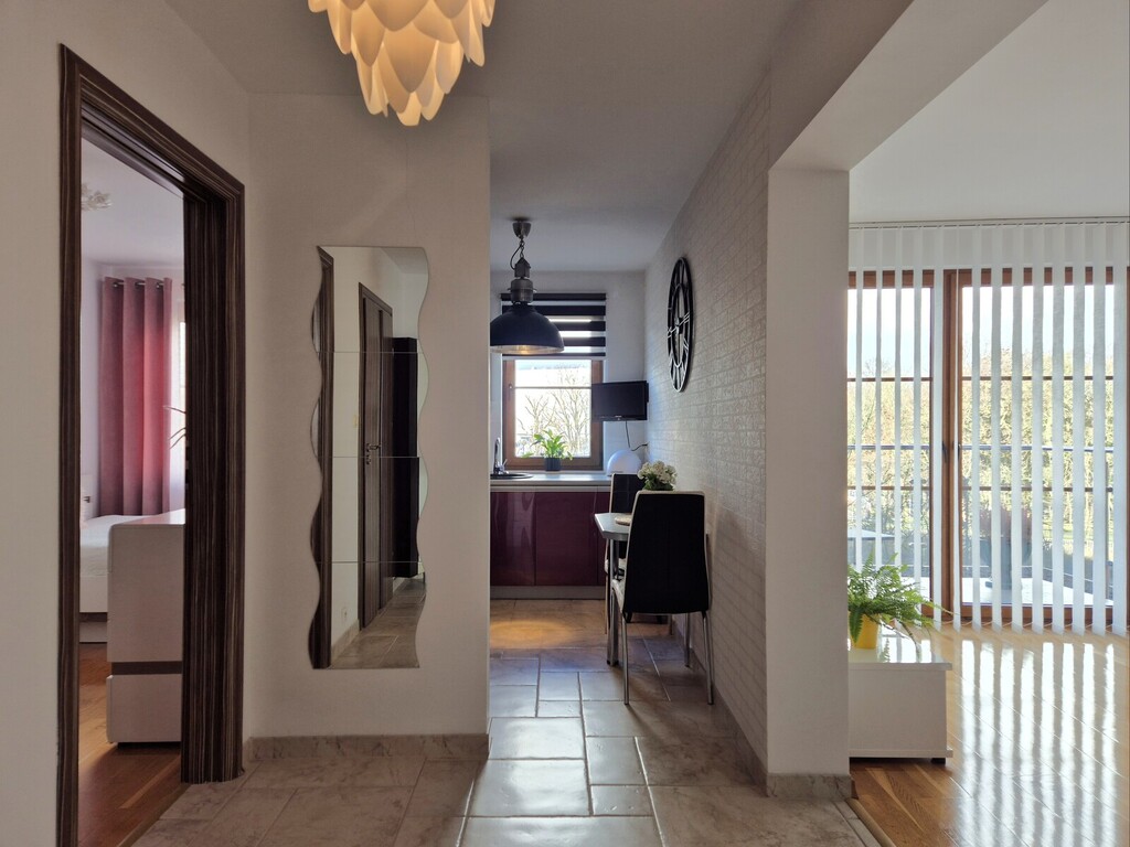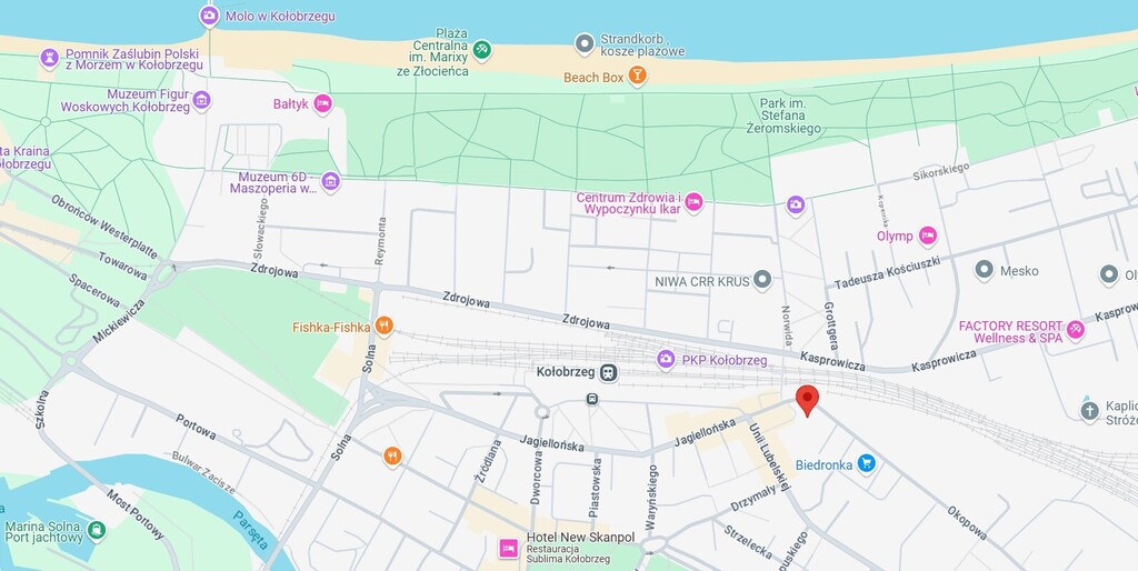 The center of Kołobrzeg, right next to the train station, which provides excellent connections with other cities, including Szczecin, Gdańsk, Poznań, and Warsaw. What’s more, right next to the building there is an entrance to the footbridge over the tracks, allowing for a convenient passage to the beach, located just 500 m away. The distance to the pier in Kołobrzeg is only 1.5 km. In the immediate vicinity we will find a pharmacy, Żabka store, Biedronka, a bank branch and numerous catering and service points. Right next to the building we also have a monitored guarded parking lot (for a fee), but there are also parking spaces available on the street in the area. The nearest airport is located 90 km away in Goleniów near Szczecin.
