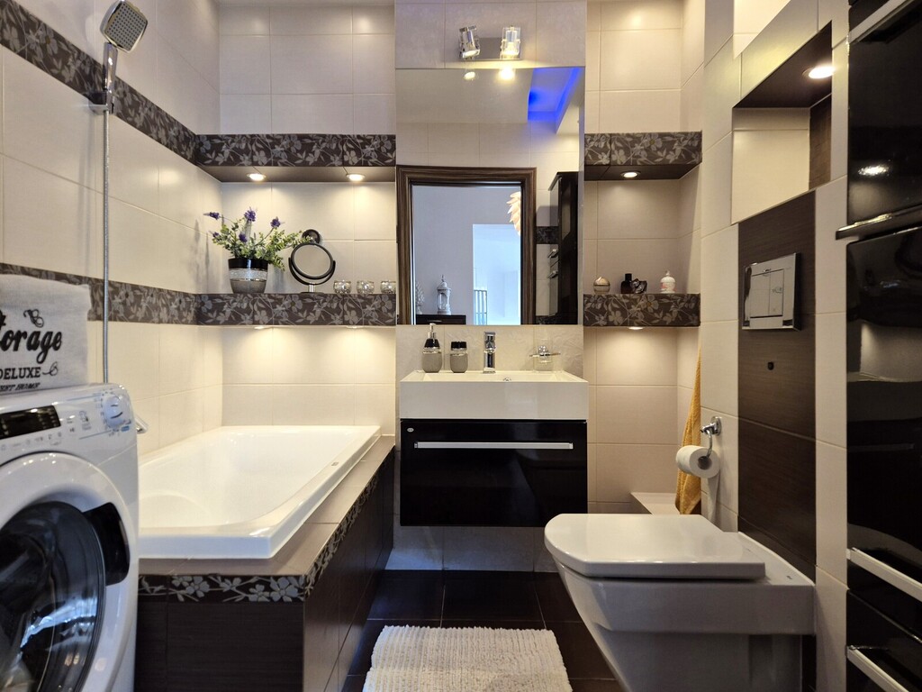 * bathroom with bathtub, countertop washbasin, concealed toilet and washing machine