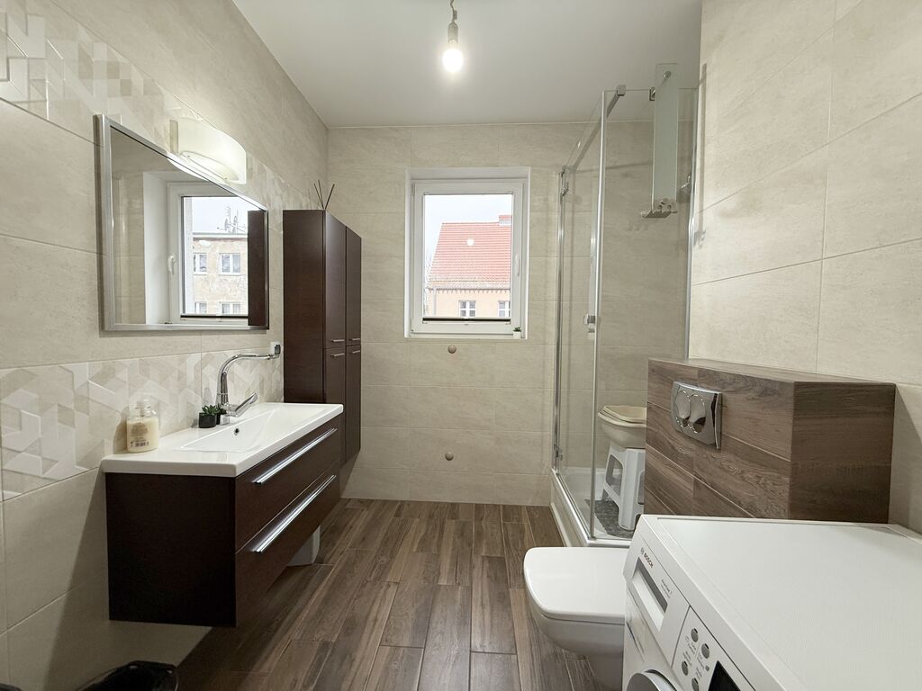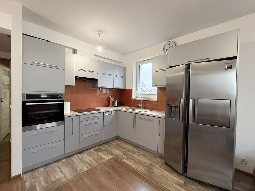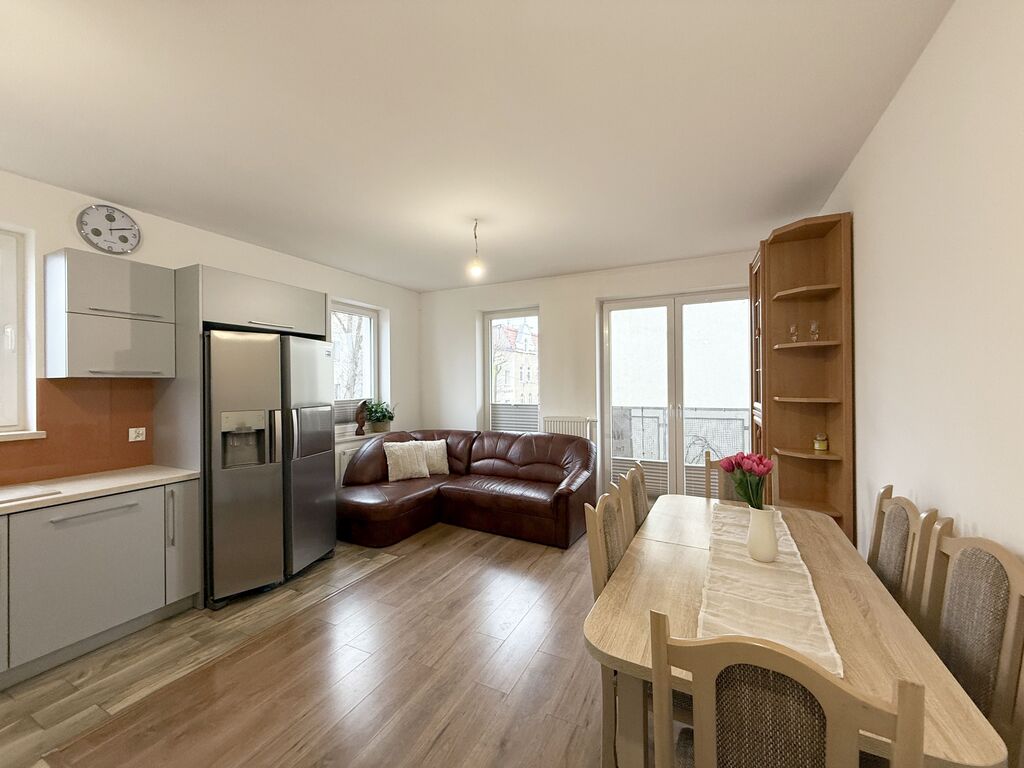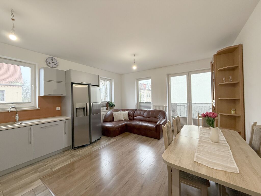 RESERVATION UNTIL 25-04-2025. 3 rooms TWO BALCONIES and TWO PARKING SPACE in the underground garage – price of 2 parking spaces additionally payable PLN 30,000. — I recommend a very attractive, spacious 3-room apartment located on the 1st floor in a 2-story building built in 2015 in a quiet part of Police. The area of the apartment is 56.49 m2, which consists of a large room with a kitchenette acting as a living room – 21.11m2 with access to a large balcony, a second room – 12.34 m2 with access to the balcony and a third room with an area of 8.70. Kitchen in the living room with custom-made kitchen furniture with household appliances (induction hob, electric oven, hood, dishwasher, 2-door refrigerator). Large bathroom with a window together with the toilet, finished with tiles and terracotta. Smooth and painted walls, light panels on the floors in the rooms, built-in wardrobes of the Komandor type in the hallway. New door joinery, PVC windows. IT IS OBLIGATORY TO BUY TWO PARKING SPACES IN THE UNDERGROUND GARAGE (the price of one space is PLN 15,000). Overall, the apartment is very well-kept, kept in warm tones. I invite you. Don't have cash to buy this property? It's not a problem, our financial advisor will obtain the most favorable financing for you. During the purchase transaction, we provide notarial services and cooperation with bank advisors. We help in negotiations and obtaining a loan for the purchase of real estate
