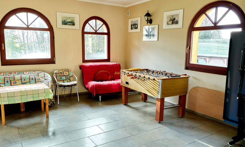 · living room – a living room with an area of approx. 85 m2 equipped with furniture necessary for residents to relax and spend time together, a dart machine and an atmospheric fireplace,