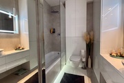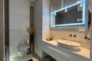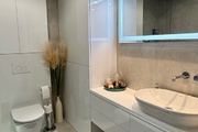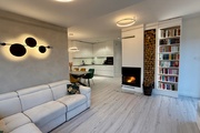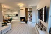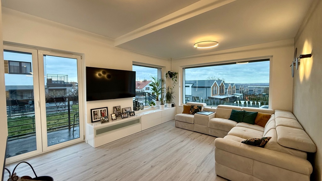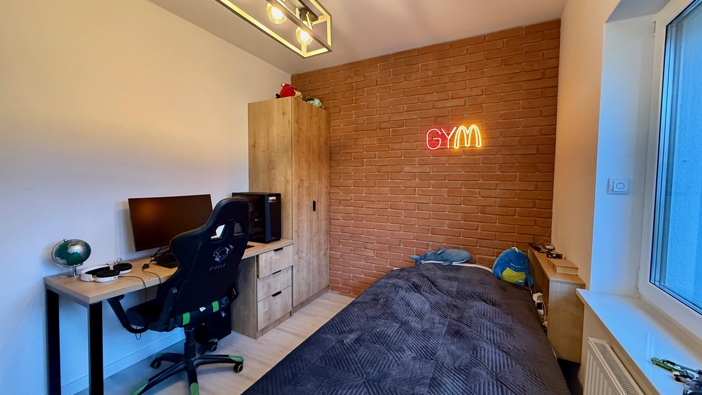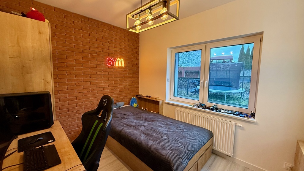 Beautiful 4-room, rent-free apartment with a garden of approx. 100m2 and a garage of 16.6m2 and a 14m2 storage room in a 4-family villa. Apartment in excellent technical condition – clean, well-kept, ready to move in. All permanent fixtures such as the kitchen, wardrobes and fireplace remain, of course. As for free-standing furniture, to be agreed for an additional fee. Living room with kitchen and dining room 35.66m2 on the floor vinyl panels. Bedroom 12.99m2 with a wardrobe, guest room 11.27m2, children's room 10.63m2. Bathroom with toilet 5.60m2 – bathtub with shower function. Spacious hall with a large built-in wardrobe. Own gas heating, two-speed condensing furnace with a closed combustion chamber. PVC window joinery with external electric blinds controlled by remote control. Installed water filter with descaling agent. Garden with automatic watering and numerous planted thujas. For the residents of the villa, i.e. 4 premises, there is a gym – recreation room with a ping-pong table. Internet – fiber optic EXCLUSIVE