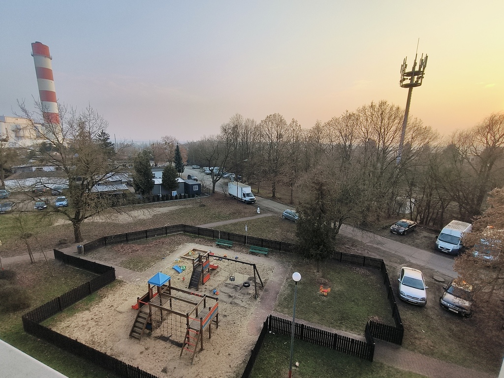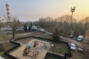 A cozy and quiet neighborhood consisting of low-rise buildings. Behind the block, a large playground visible from the apartment windows. Right next to it, a park.