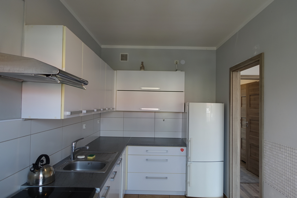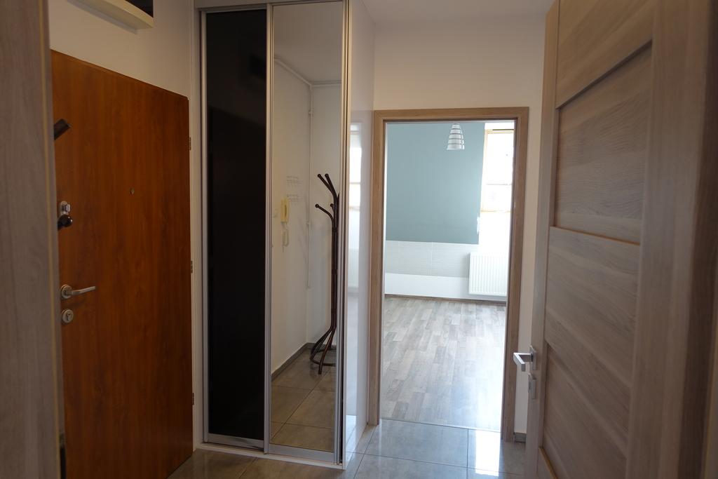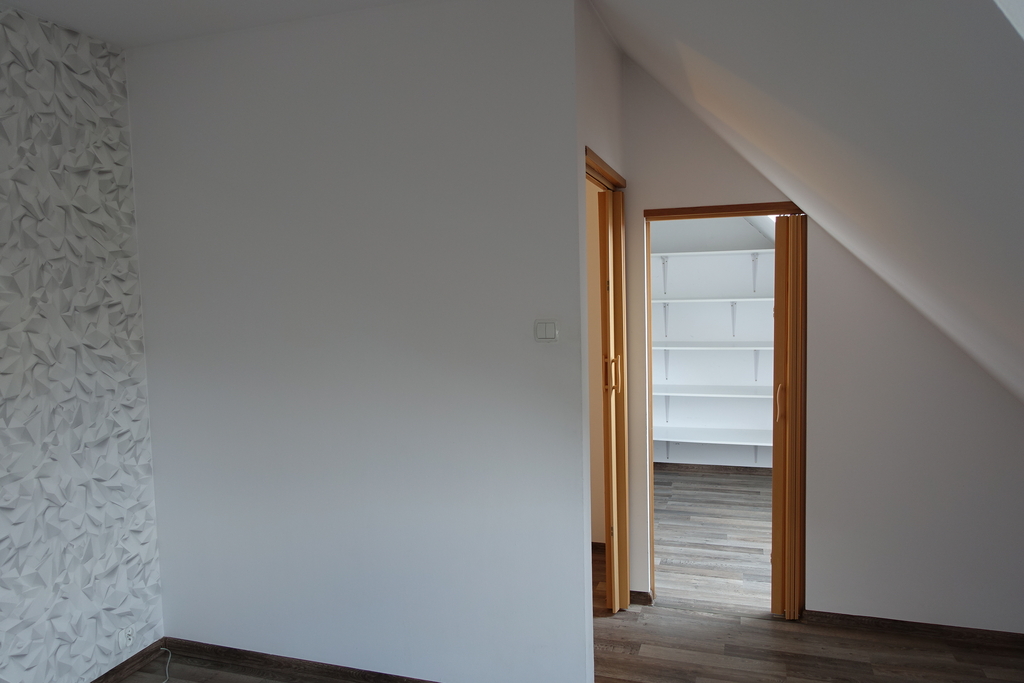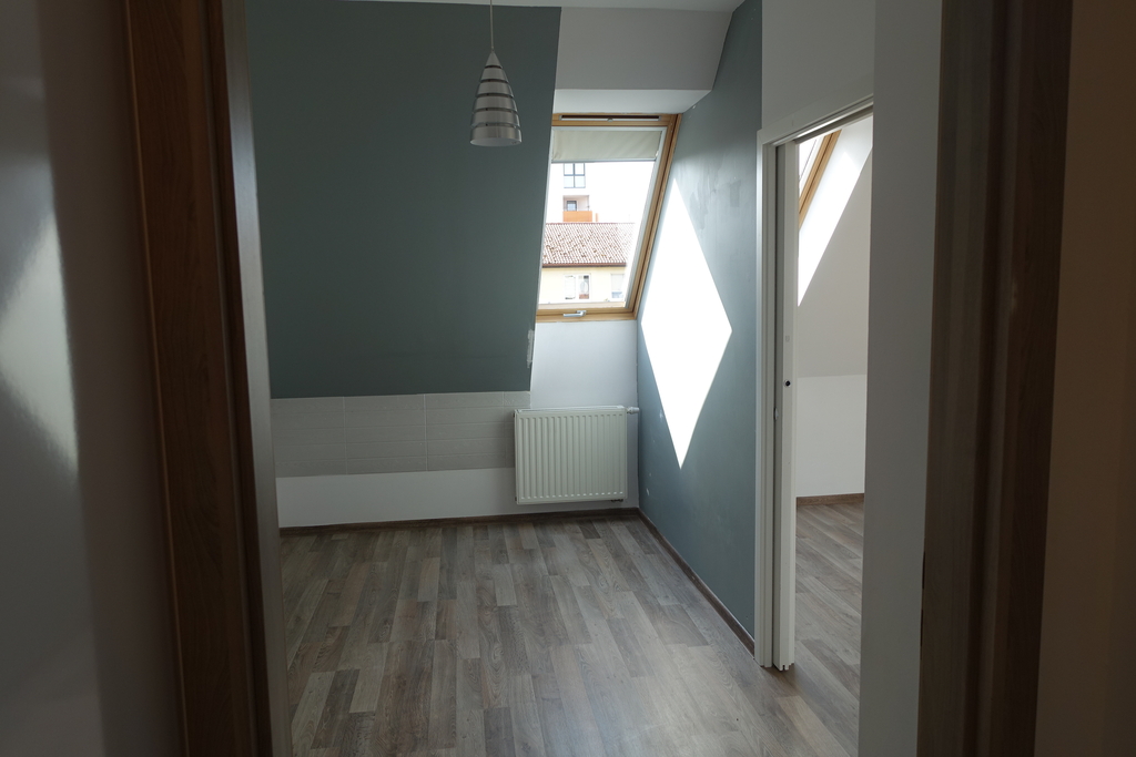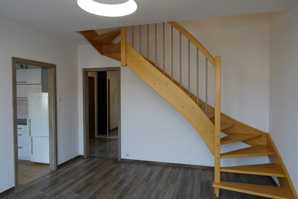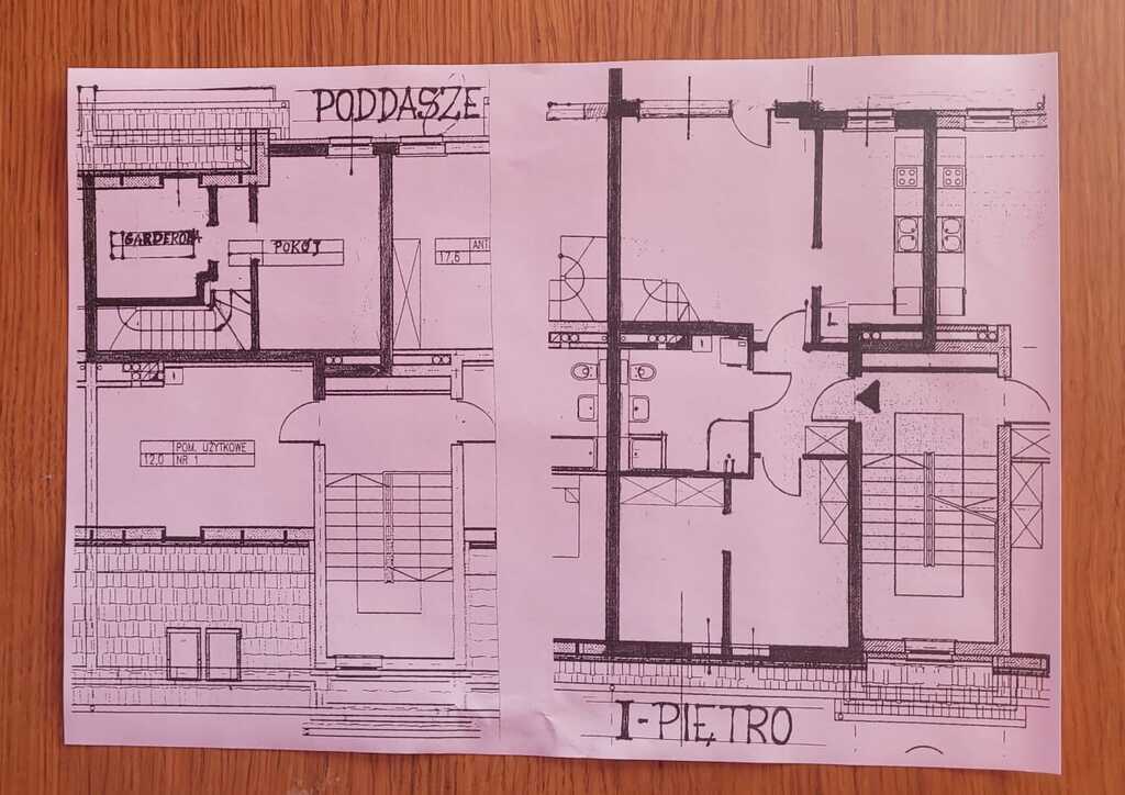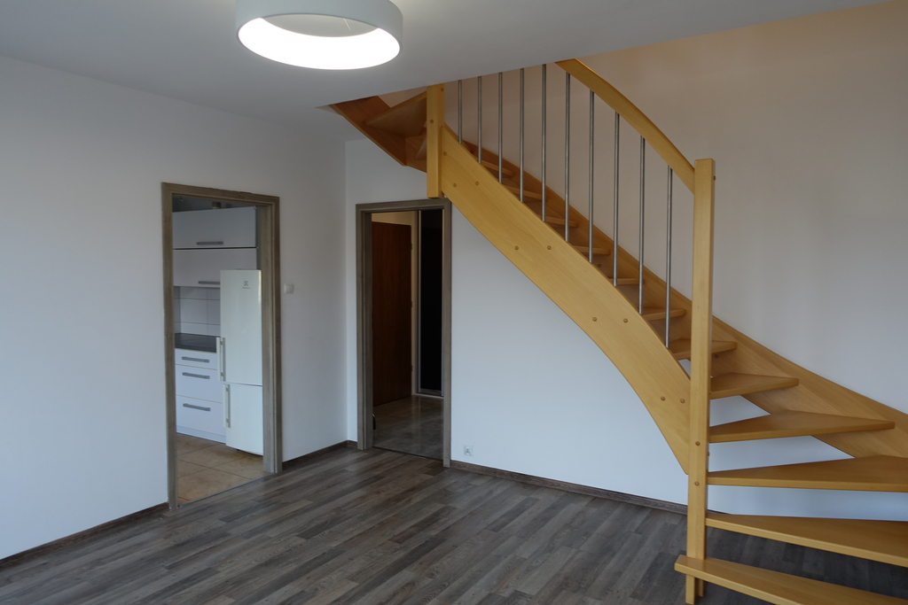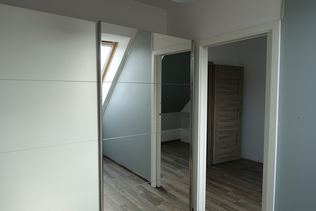 4-room apartment, two-level with a usable area of 73.4 m2 (total floor area 80 m2) 1st and 2nd floor of a low multi-family building in Przecław. 1st LEVEL: living room 17.3 m2 connected to the kitchen 11.6 m2 bedroom 14.5 m2 – which has been divided into 2 separate rooms, bathroom 7.6 m2. From the living room exit to the balcony approx. 4 m2 and entrance by stairs to the 2nd level. 2nd LEVEL: large bedroom with wardrobe with an area of 17.6 m2. On the floor panels in the rooms and polished stoneware in the rest of the apartment. Walls in a smooth finish painted white. Marble window sills, PVC and roof windows at the top, nice internal and anti-burglary external doors. Kitchen fitted with custom-made furniture with household appliances (fridge, gas stove, extractor hood, dishwasher). In the hall a wardrobe of the Komandor type. Bathroom in tiles and terracotta with shower, washbasin and toilet. Gas heating. Rent 590 PLN for 4 people.