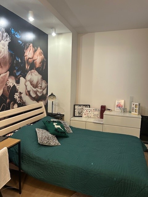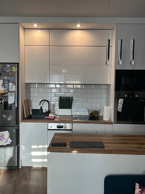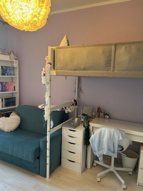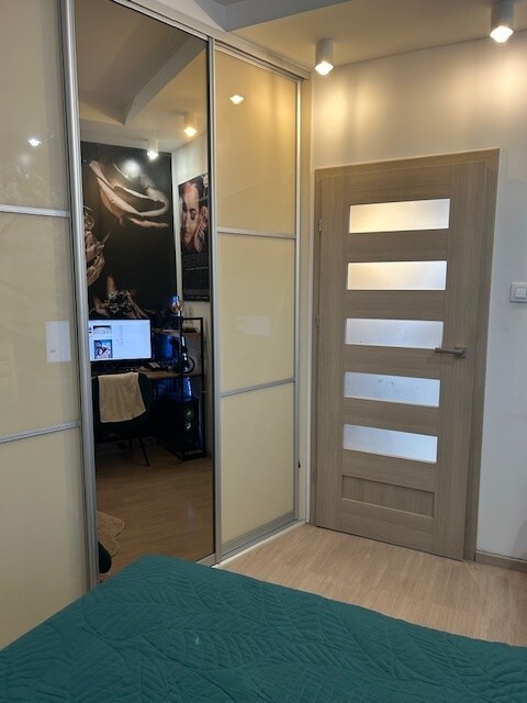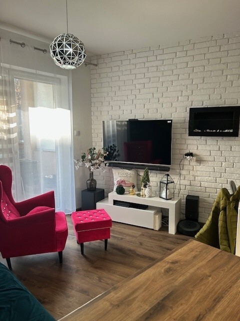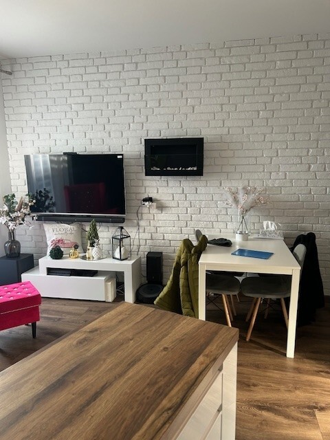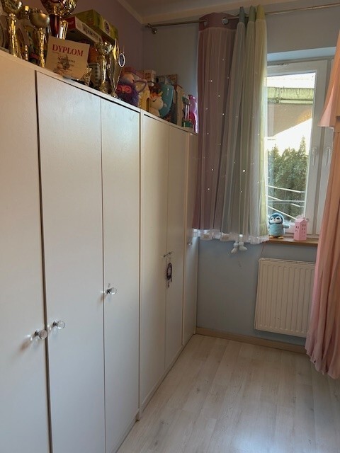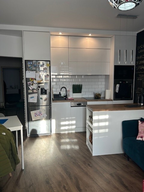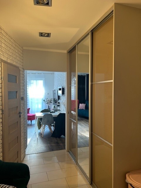I recommend for sale an apartment ideal for a couple or a young family due to its location in a sought-after location as well as the standard of finish. The apartment has a very functional layout, finished in bright colors with great attention to detail. The equipment includes built-in furniture – each bedroom has a custom-made wardrobe and kitchen furniture with household appliances. The property consists of two bedrooms and a kitchen connected to the living room by a peninsula. From the living room there is an exit to a spacious balcony on which there is room for furniture allowing you to relax in your free time. From the balcony there is an exit to a small but intimate garden. The entire apartment is decorated a bit in the so-loved Scandinavian style. The condition of the property is very good and does not require additional expenses to live in it. I invite you to view