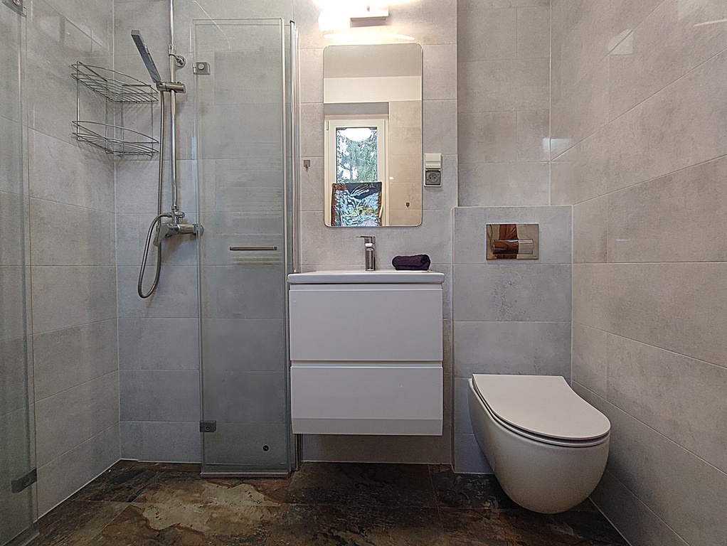 * bathroom with shower and toilet.