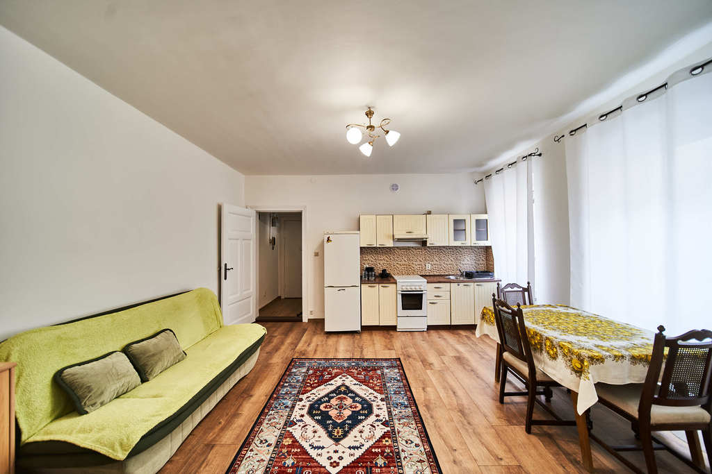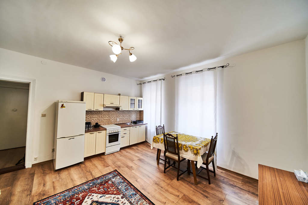 The apartment has an area of 50 m2 and is divided into 2 rooms, a kitchenette with a window, a bathroom with a toilet and a hall. The rooms have panels on the floors, smooth and painted walls. The kitchen is fitted with furniture, equipped with household appliances (fridge, oven, hood, gas hob. Bathroom + toilet with a bathtub, finished with tiles and terracotta.