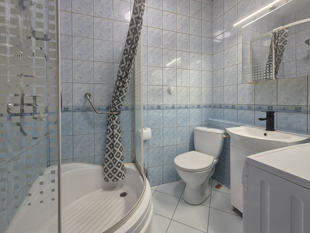 * bathroom with shower, toilet, sink and washing machine; double-circuit gas boiler still under warranty