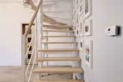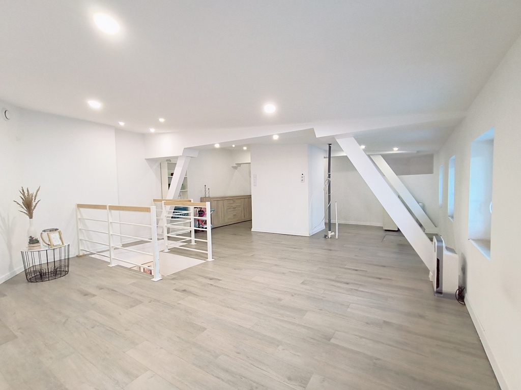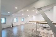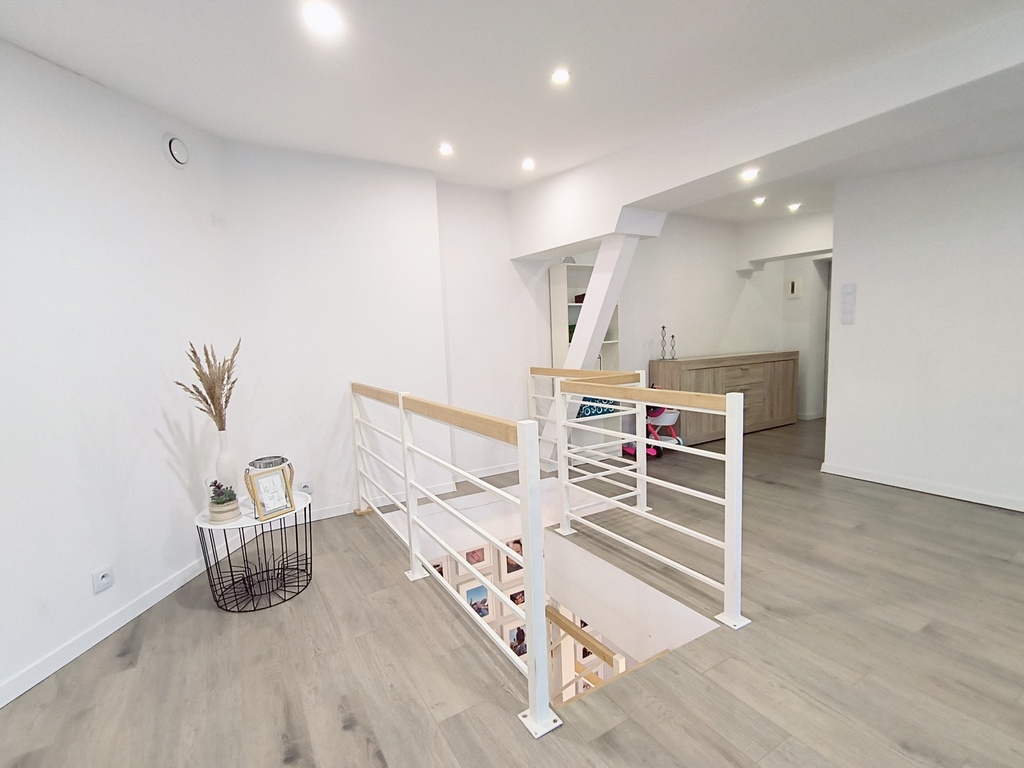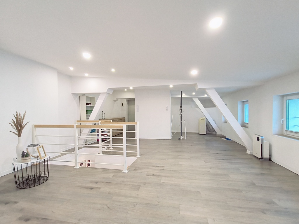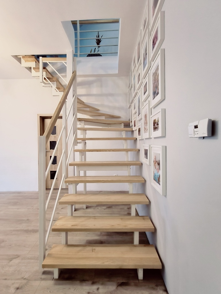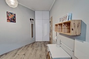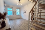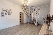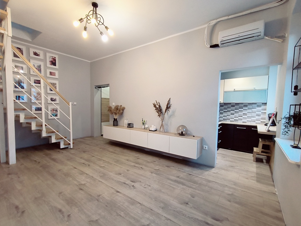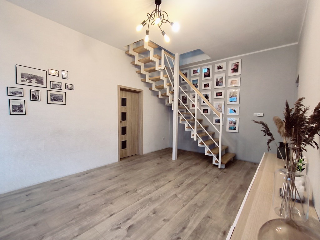 In the rooms on the 1st level, there are vinyl panels on the floors, while in the kitchen, bathroom and hallway there are tiles. On the 2nd level, which is accessed by stairs made of ash wood, there are stoneware tiles on the floor. The walls in the apartment are smoothed and painted. PVC windows.