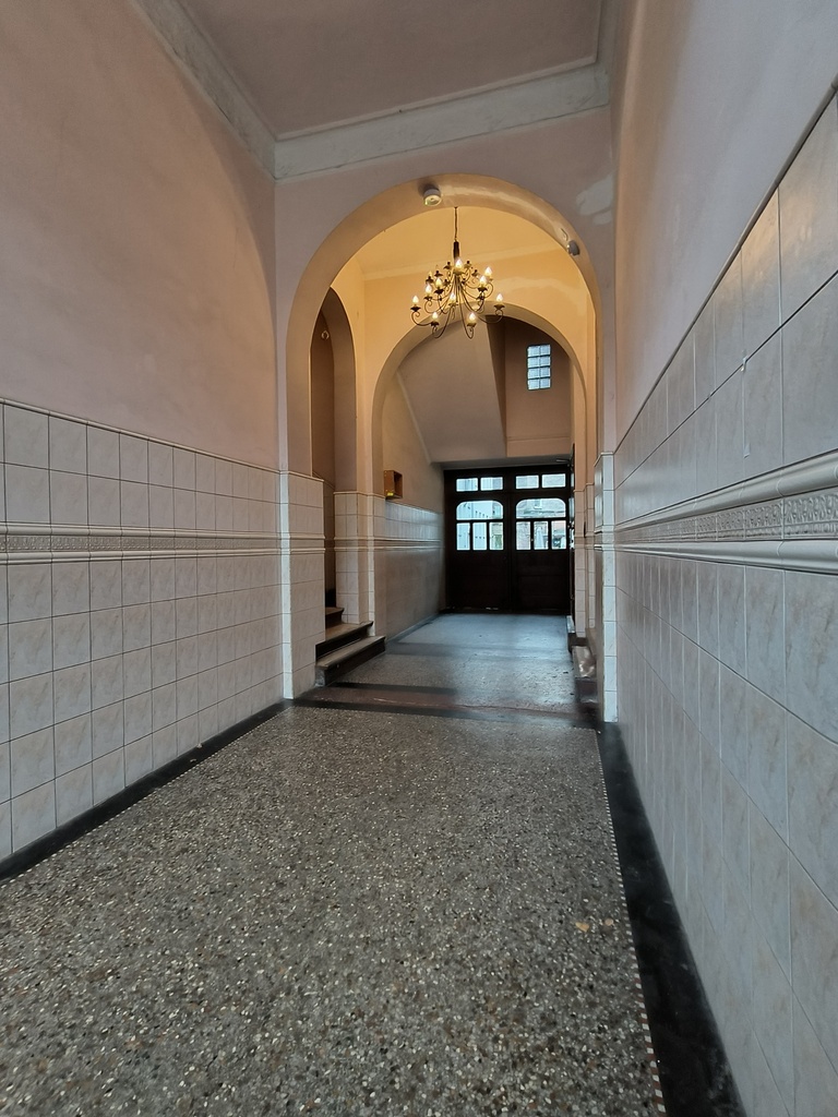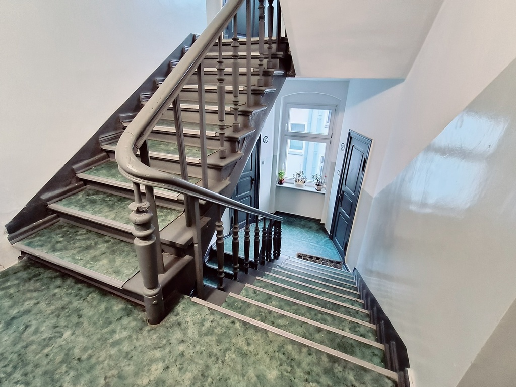 Apartment located on the 3rd and 4th floor of a tenement house in the second line of development. The building’s facade after thermal modernization in 2022. Staircase after renovation, clean and well-kept.