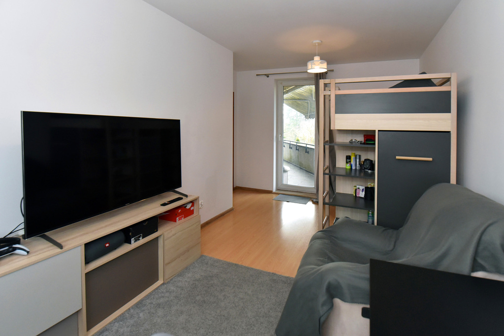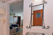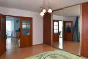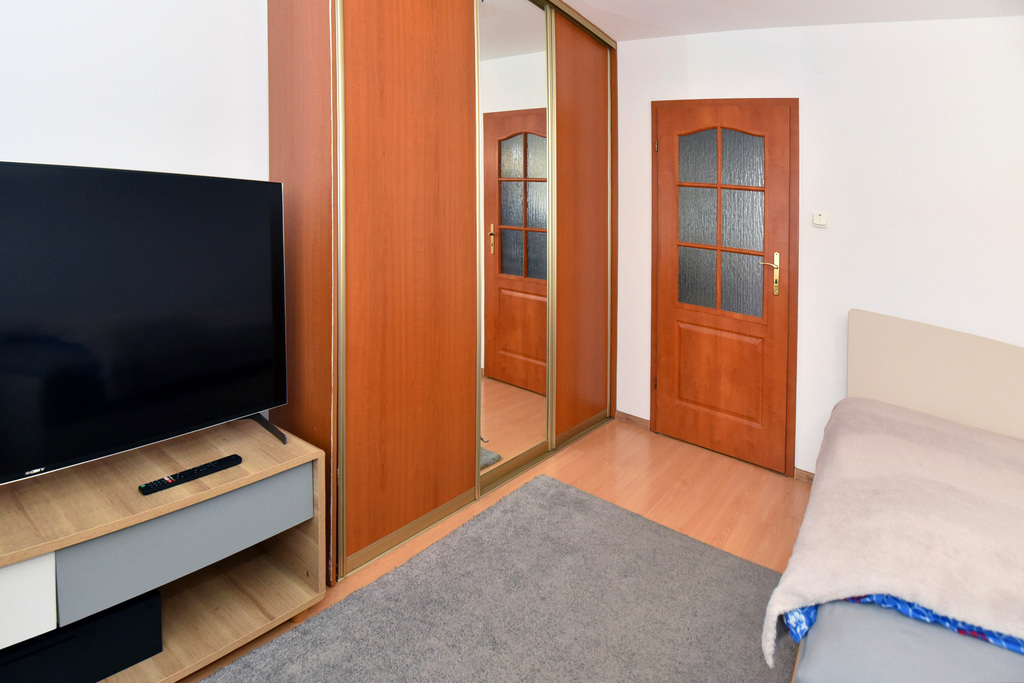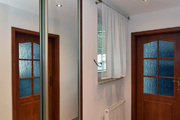 – bedroom 1 with balcony and wardrobe 25m2, permanent construction in the form of a large wardrobe along the entire length of the wall and an additional wardrobe room. View from the bedroom onto the gardens, quiet and warm room.